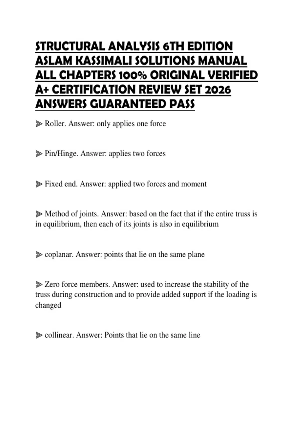 STRUCTURAL ANALYSIS 6TH EDITION ASLAM KASSIMALI SOLUTIONS MANUAL ALL CHAPTERS 100% ORIGINAL VERIFIED A+ CERTIFICATION REVIEW SET 2026 ANSWERS GUARANTEED PASS