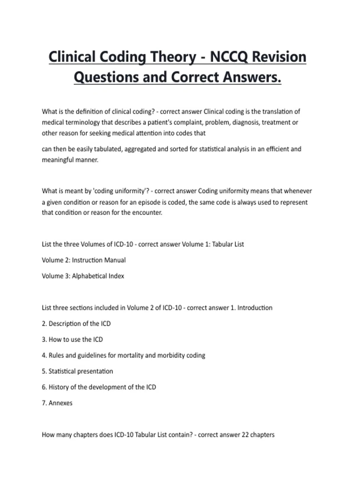 What is the definition of clinical coding? - correct answer Clinical coding is the translation of medical terminology that describes a patient's complaint, problem, diagnosis, treatment or other reason for seeking medical attention into codes that can then be easily tabulated, aggregated and sorted for statistical analysis in an efficient and meaningful manner. What is meant by 'coding uniformity'? - correct answer Coding uniformity means that whenever a given condition or reason for an episode is coded, the same code is always used to represent that condition or reason for the encounter. List the three Volumes of ICD-10 - correct answer Volume 1: Tabular List Volume 2: Instruction Manual Volume 3: Alphabetical Index List three sections included in Volume 2 of ICD-10 - correct answer 1. Introduction 2. Description of the ICD 3. How to use the ICD 4. Rules and guidelines for mortality and morbidity coding 5. Statistical presentation 6. History of the development of the ICD 7. Annexes