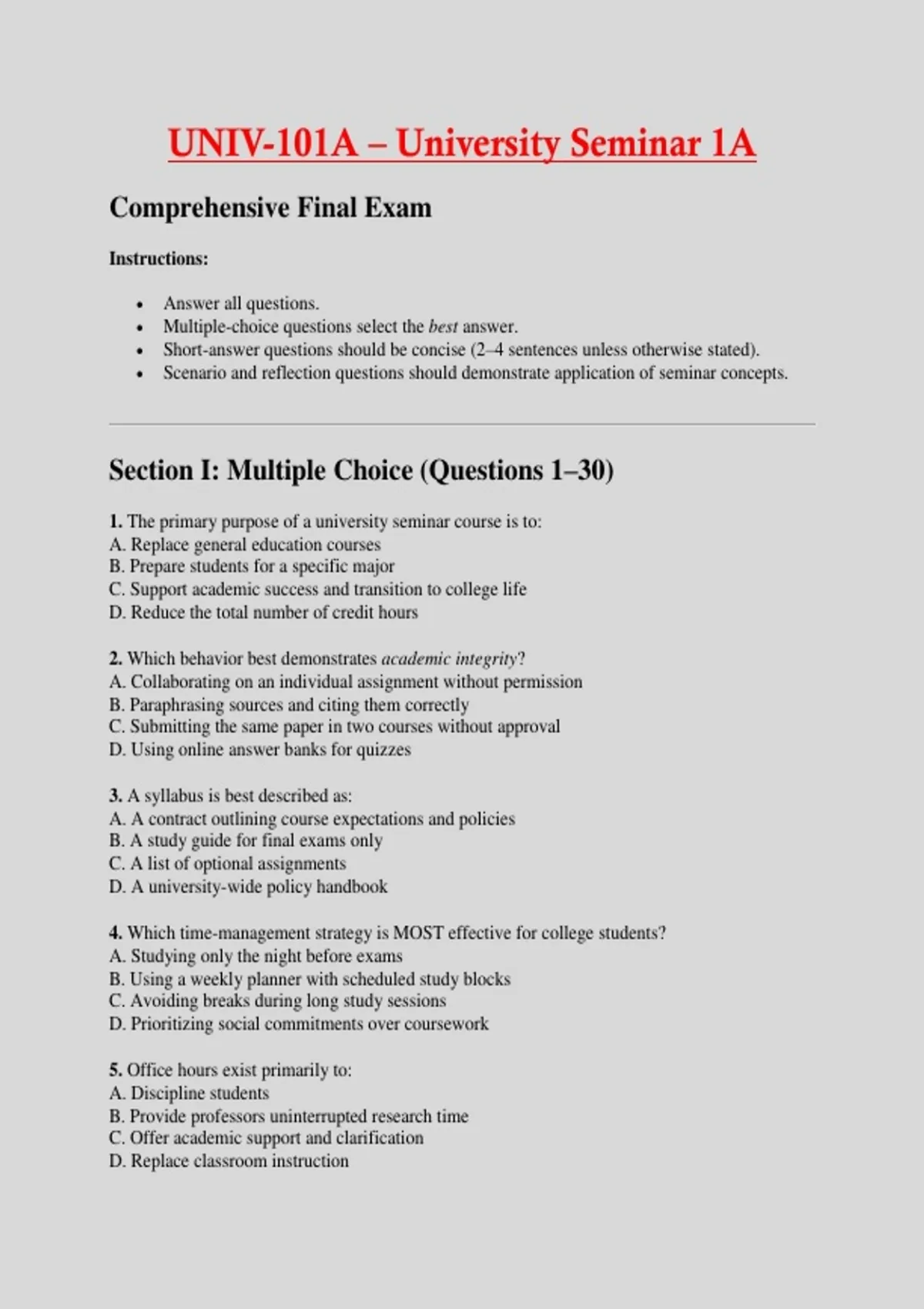 UNIV-101A – University Seminar 1A Comprehensive Final Exam Instructions:  Answer all questions.  Multiple-choice questions select the best answer.  Short-answer questions should be concise (2–4 sentences unless otherwise stated).  Scenario and reflection questions should demonstrate application of seminar concepts. Section I: Multiple Choice (Questions 1–30) 1. The primary purpose of a university seminar course is to: A. Replace general education courses B. Prepare students for a specific major C. Support academic success and transition to college life D. Reduce the total number of credit hours 2. Which behavior best demonstrates academic integrity? A. Collaborating on an individual assignment without permission B. Paraphrasing sources and citing them correctly C. Submitting the same paper in two courses without approval D. Using online answer banks for quizzes 3. A syllabus is best described as: A. A contract outlining course expectations and policies B. A study guide for final exams only C. A list of optional assignments D. A university-wide policy handbook 4. Which time-management strategy is MOST effective for college students? A. Studying only the night before exams B. Using a weekly planner with scheduled study blocks C. Avoiding breaks during long study sessions D. Prioritizing social commitments over coursework