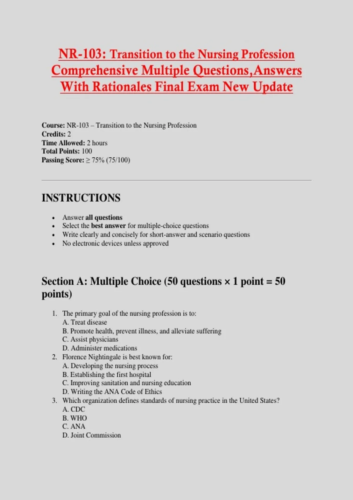 NR-103: Transition to the Nursing Profession Comprehensive Multiple Questions,Answers With Rationales Final Exam New Update Course: NR-103 – Transition to the Nursing Profession Credits: 2 Time Allowed: 2 hours Total Points: 100 Passing Score: ≥ 75% (75/100) INSTRUCTIONS  Answer all questions  Select the best answer for multiple-choice questions  Write clearly and concisely for short-answer and scenario questions  No electronic devices unless approved Section A: Multiple Choice (50 questions × 1 point = 50 points) 1. The primary goal of the nursing profession is to: A. Treat disease B. Promote health, prevent illness, and alleviate suffering C. Assist physicians D. Administer medications 2. Florence Nightingale is best known for: A. Developing the nursing process B. Establishing the first hospital C. Improving sanitation and nursing education D. Writing the ANA Code of Ethics 3. Which organization defines standards of nursing practice in the United States? A. CDC B. WHO C. ANA D. Joint Commission 4. A licensed practical nurse (LPN) differs from a registered nurse (RN) primarily in: A. Scope of practice B. Ethical responsibilities C. Patient advocacy role D. Communication skills 5. Evidence-based practice is best defined as: A. Following hospital policy B. Using textbooks only C. Integrating research, clinical expertise, and patient values D. Relying on physician orders 6. The nursing process includes all EXCEPT: A. Assessment B. Diagnosis C. Prescription D. Evaluation 7. Accountability in nursing means: