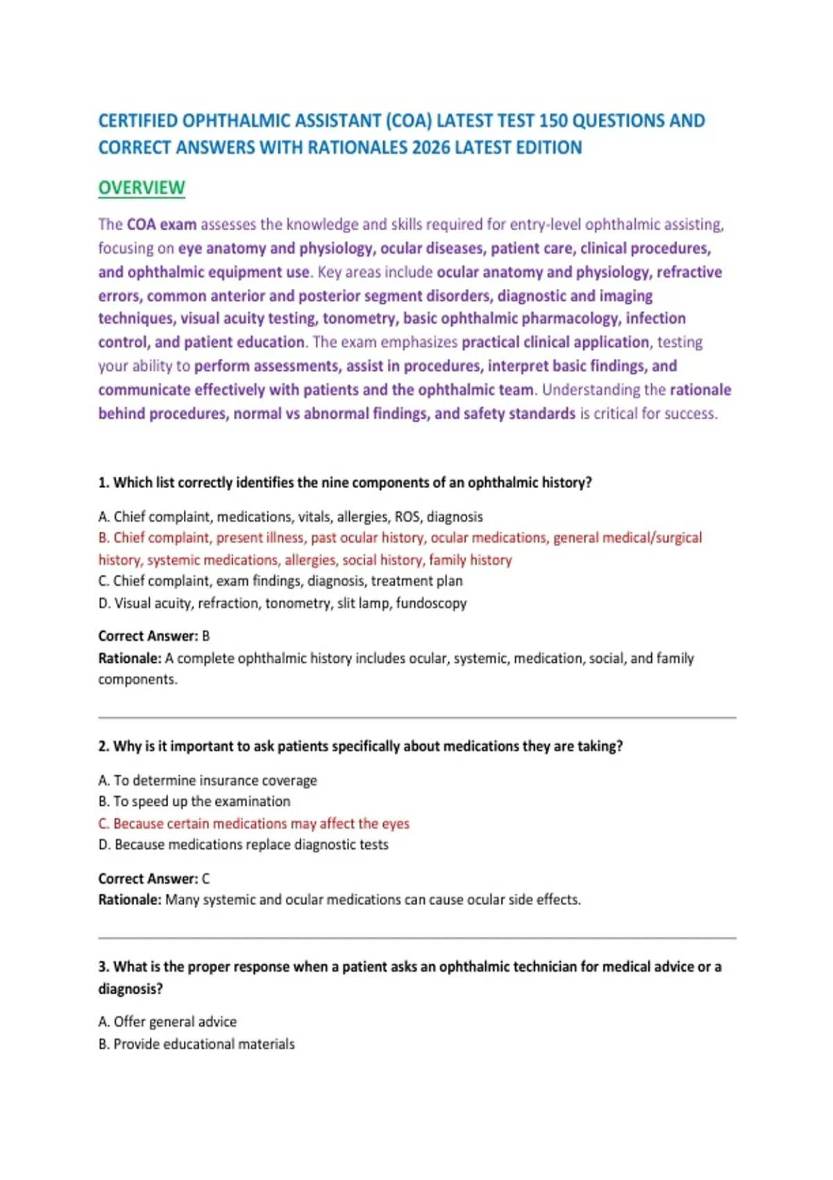 CERTIFIED OPHTHALMIC ASSISTANT (COA) LATEST TEST 150 QUESTIONS AND CORRECT ANSWERS WITH RATIONALES 2026 LATEST EDITION