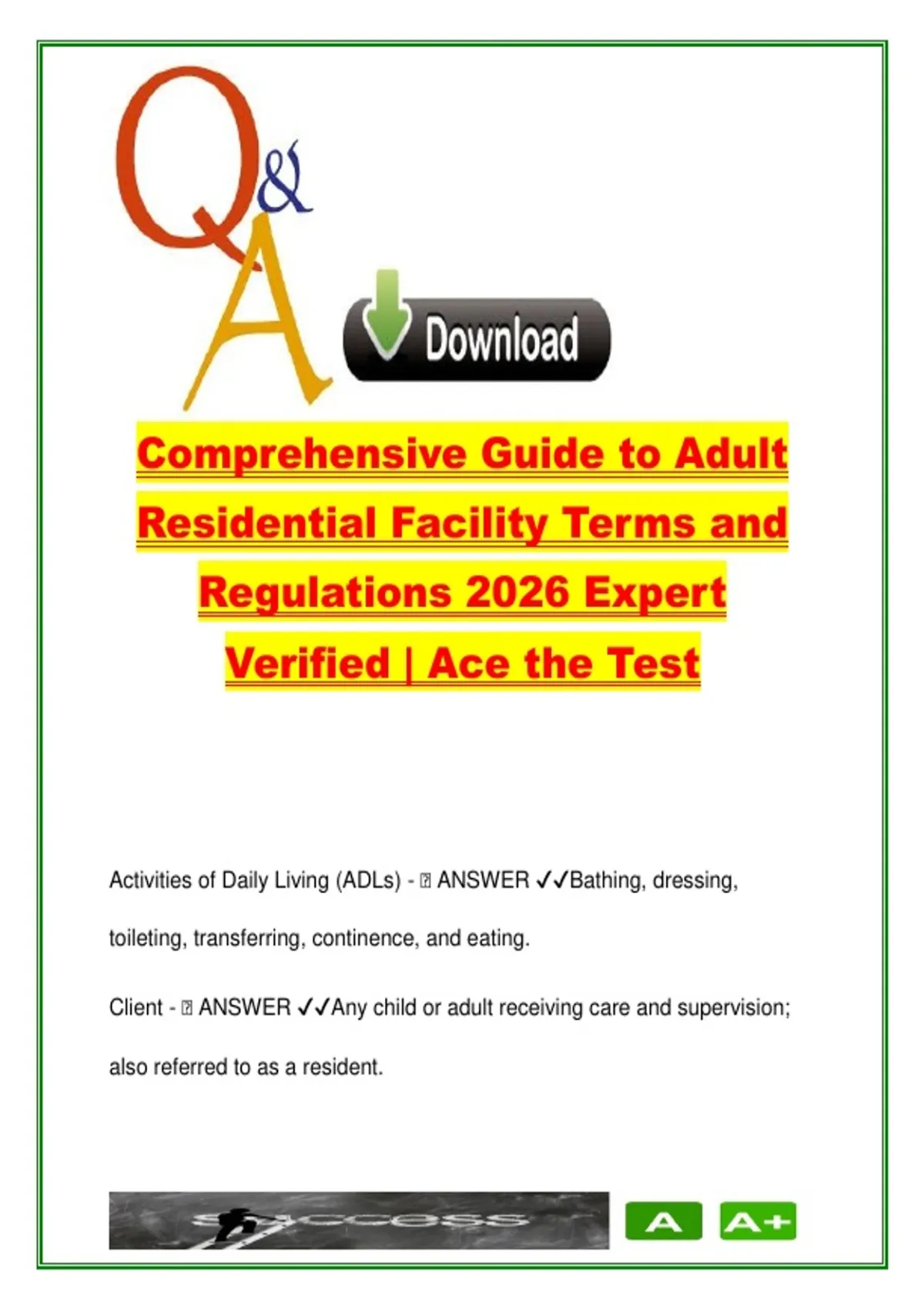 This expert-verified 2026 study guide covers over 200 key questions and answers aligned with California’s Adult Residential Facility (ARF) licensing regulations under Title 22, Division 6. It serves as a comprehensive glossary and flashcard-based review of terms required for the ARF Administrator Certification Exam administered by the California Department of Social Services (DSS). Each entry follows a Q&A format, reinforcing understanding of legal definitions, health & safety compliance, licensing procedures, emergency protocols, medication management, and behavior intervention standards. Topics span: Client classification (ambulatory, nonambulatory, terminally ill) and levels of care Facility licensing, provisional licenses, criminal record exemptions, inspection rights Emergency Intervention Plans (EIPs), seclusion rules, restraint limitations Administrator qualifications and duties, including CE vendor approval and coursework Mandated reporter responsibilities, abuse reporting deadlines, and penalty structures Core medical terms: ADLs, PRN meds, AED usage, CPAP, developmental disabilities Client rights, trauma reduction, universal precautions, and complaint investigation processes DSS procedures like: denial, revocation, unlicensed facility penalties, disaster plans, and relocation protocols This resource is ideal for: ARF Administrator Exam candidates in California Students in Human Services, Gerontology, Nursing, Social Work, Public Health, or RCFE training programs Care facility administrators, directors, or program coordinators managing licensed adult or community care programs DSS and CCLD trainees preparing for audits or internal compliance training The guide is closely tied to official licensing language from Title 22, Health & Safety Code §1569, WIC §15630, and other California DSS regulatory documents. Each entry is crafted to aid memorization, comprehension, and exam success, with terminology directly applicable to real-world facility operations and DSS audits. Keywords: ARF Q&A 2026, California DSS exam, Title 22 ARF terms, community care licensing definitions, adult residential facility flashcards, EIP rules California, certified administrator qualifications, criminal exemption DSS, facility license capacity, medication regulation PRN, client rights restraint, emergency intervention plan DSS, licensing agency terms, health screening licensing, CPAP client care, nonambulatory definition, universal precautions ARF