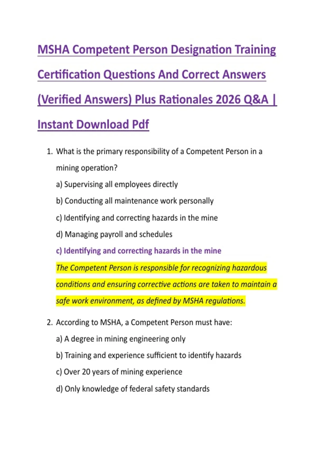 MSHA Competent Person Designation Training Certification Questions And Correct Answers (Verified Answers) Plus Rationales 2026 Q&A | Instant Download Pdf