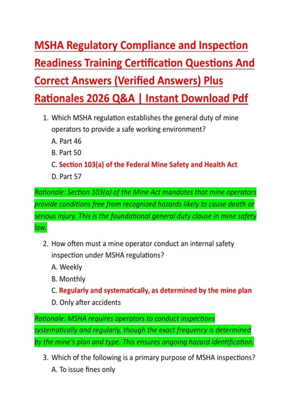 MSHA Regulatory Compliance and Inspection Readiness Training Certification Questions And Correct Answers (Verified Answers) Plus Rationales 2026 Q&A | Instant Download Pdf