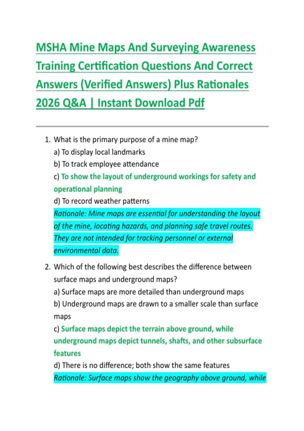 MSHA Mine Maps And Surveying Awareness Training Certification Questions And Correct Answers (Verified Answers) Plus Rationales 2026 Q&A | Instant Download Pdf