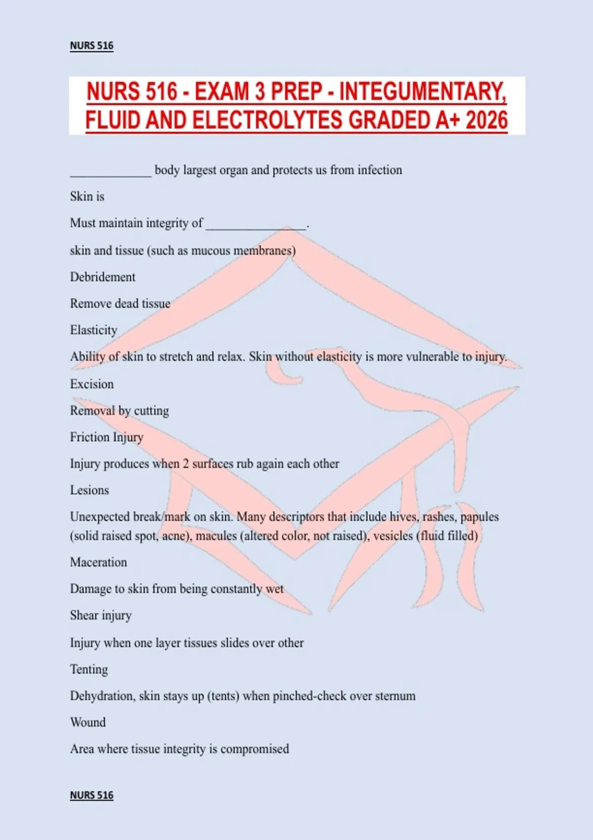 NURS 516 - EXAM 3 PREP - INTEGUMENTARY, FLUID AND ELECTROLYTES GRADED A+ 2026