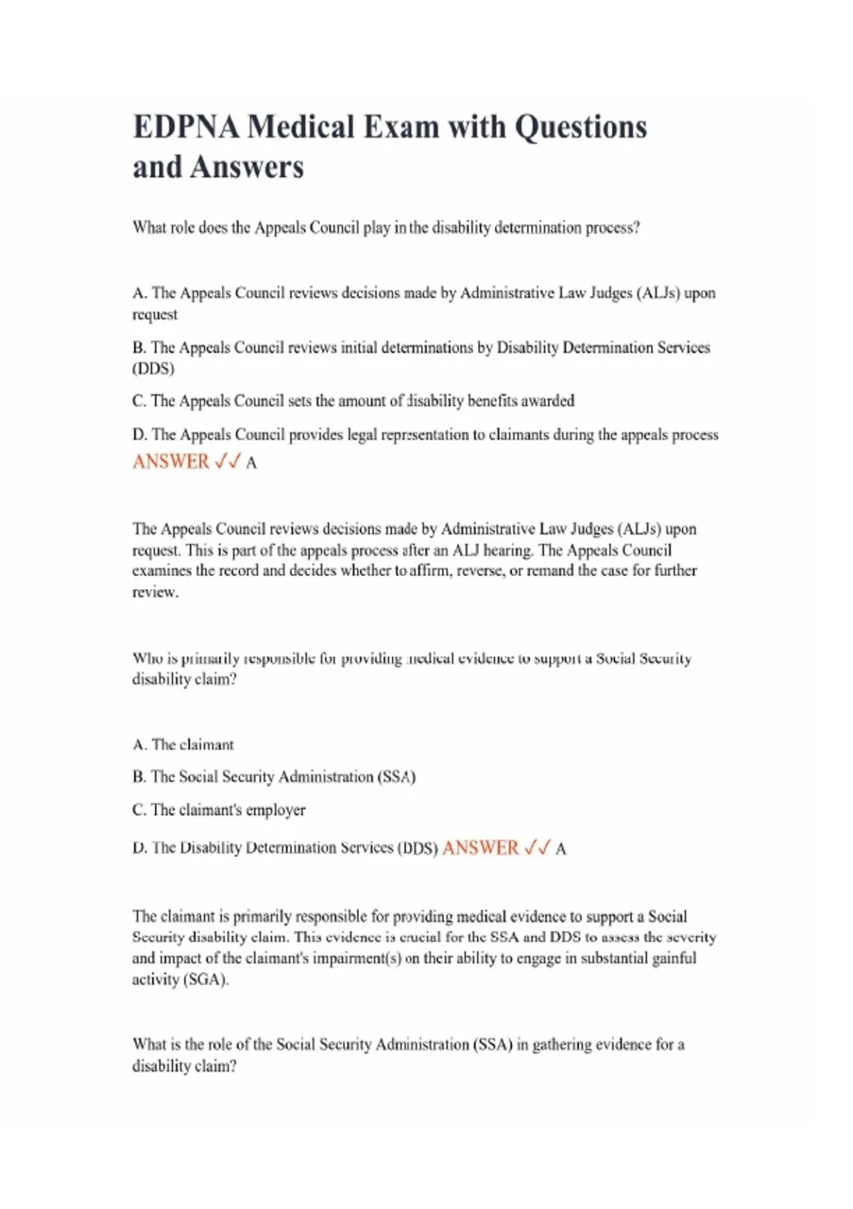 EDPNA Medical Exam with Questions and Answers What role does the Appeals Council play in the disability determination process? A. The Appeals Council reviews decisions made by Administrative Law Judges (ALJs) upon request B. The Appeals Council reviews initial determinations by Disability Determination Services (DDS) C. The Appeals Council sets the amount of disability benefits awarded D. The Appeals Council provides legal representation to claimants during the appeals process ANSWER A The Appeals Council reviews decisions made by Administrative Law Judges (ALJs) upon request. This is part of the appeals process after an ALJ hearing. The Appeals Council examines the record and decides whether to affirm, reverse, or remand the case for further review. Who is primarily responsible for providing medical evidence to support a Social Security disability claim? A. The claimant B. The Social Security Administration (SSA) C. The claimant's employer D. The Disability Determination Services (DDS) ANSWER A The claimant is primarily responsible for providing medical evidence to support a Social Security disability claim. This evidence is crucial for the SSA and DDS to assess the severity and impact of the claimant's impairment(s) on their ability to engage in substantial gainful activity (SGA). What is the role of the Social Security Administration (SSA) in gathering evidence for a disability claim?