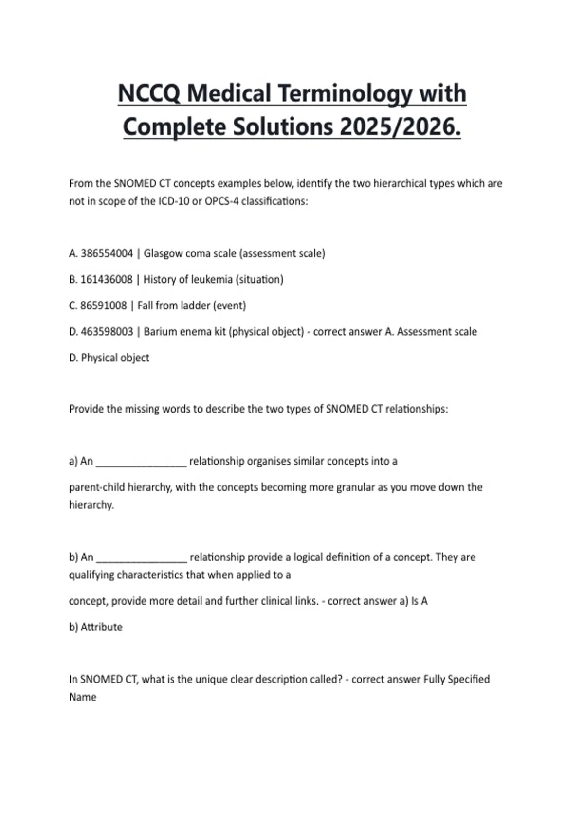 From the SNOMED CT concepts examples below, identify the two hierarchical types which are not in scope of the ICD-10 or OPCS-4 classifications: A. | Glasgow coma scale (assessment scale) B. | History of leukemia (situation) C. | Fall from ladder (event) D. | Barium enema kit (physical object) - correct answer A. Assessment scale D. Physical object Provide the missing words to describe the two types of SNOMED CT relationships: a) An ________________ relationship organises similar concepts into a parent-child hierarchy, with the concepts becoming more granular as you move down the hierarchy. b) An ________________ relationship provide a logical definition of a concept. They are qualifying characteristics that when applied to a concept, provide more detail and further clinical links. - correct answer a) Is A b) Attribute In SNOMED CT, what is the unique clear description called? - correct answer Fully Specified Name