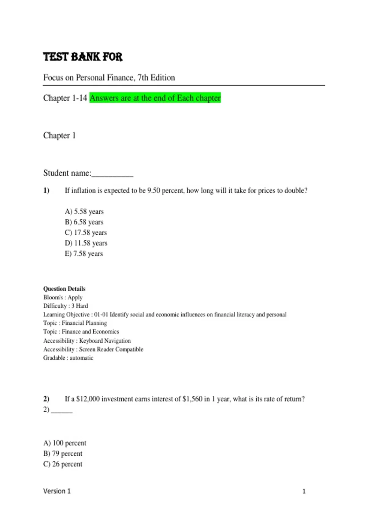 ,2 of 1082 Test Bank for Focus on Personal Finance,