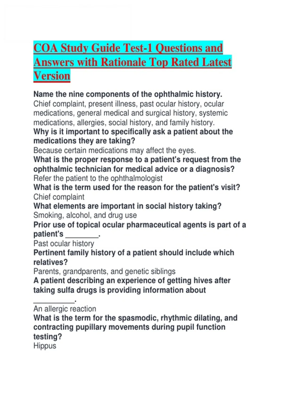 COA Study Guide Test-1 Questions and Answers with Rationale Top Rated Latest Version