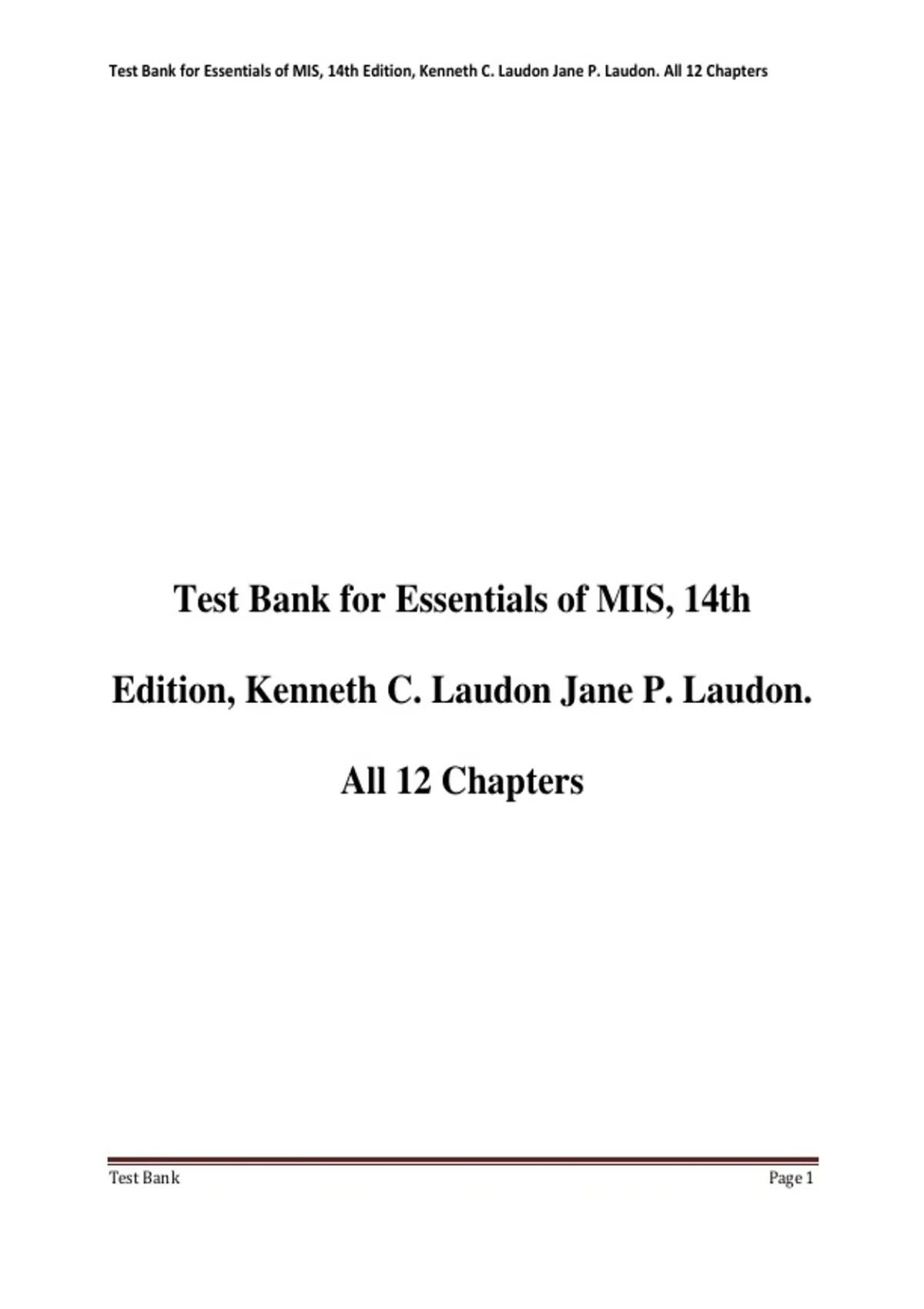 Access the Test Bank for Essentials of MIS, 14th Edition by Kenneth C. Laudon & Jane P. Laudon (All 12 Chapters), fully 2026 updated. This test bank includes comprehensive exam questions with accurate answers, helping students and instructors master management information systems concepts, digital firm management, IT strategies, and exam preparation for coursework and assessments.