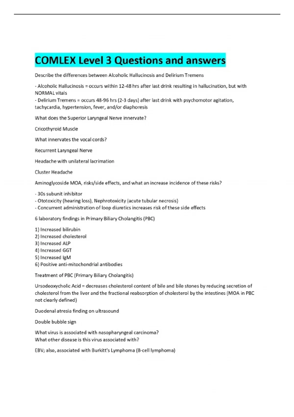 COMLEX Level 3 Questions and answers Describe the differences between Alcoholic Hallucinosis and Delirium Tremens - Alcoholic Hallucinosis = occurs within 12-48 hrs after last drink resulting in hallucination, but with NORMAL vitals - Delirium Tremens = occurs 48-96 hrs (2-3 days) after last drink with psychomotor agitation, tachycardia, hypertension, fever, and/or diaphoresis What does the Superior Laryngeal Nerve innervate? Cricothyroid Muscle What innervates the vocal cords? Recurrent Laryngeal Nerve Headache with unilateral lacrimation Cluster Headache Aminoglycoside MOA, risks/side effects, and what an increase incidence of these risks? - 30s subunit inhibitor - Ototoxicity (hearing loss), Nephrotoxicity (acute tubular necrosis) - Concurrent administration of loop diuretics increases risk of these side effects 6 laboratory findings in Primary Biliary Cholangitis (PBC) 1) Increased bilirubin 2) Increased cholesterol 3) Increased ALP 4) Increased GGT 5) Increased IgM 6) Positive anti-mitochondrial antibodies Treatment of PBC (Primary Biliary Cholangitis) Ursodeoxycholic Acid = decreases cholesterol content of bile and bile stones by reducing secretion of cholesterol from the liver and the fractional reabsorption of cholesterol by the intestines (MOA in PBC not clearly defined) Duodenal atresia finding on ultrasound Double bubble sign What virus is associated with nasopharyngeal carcinoma?