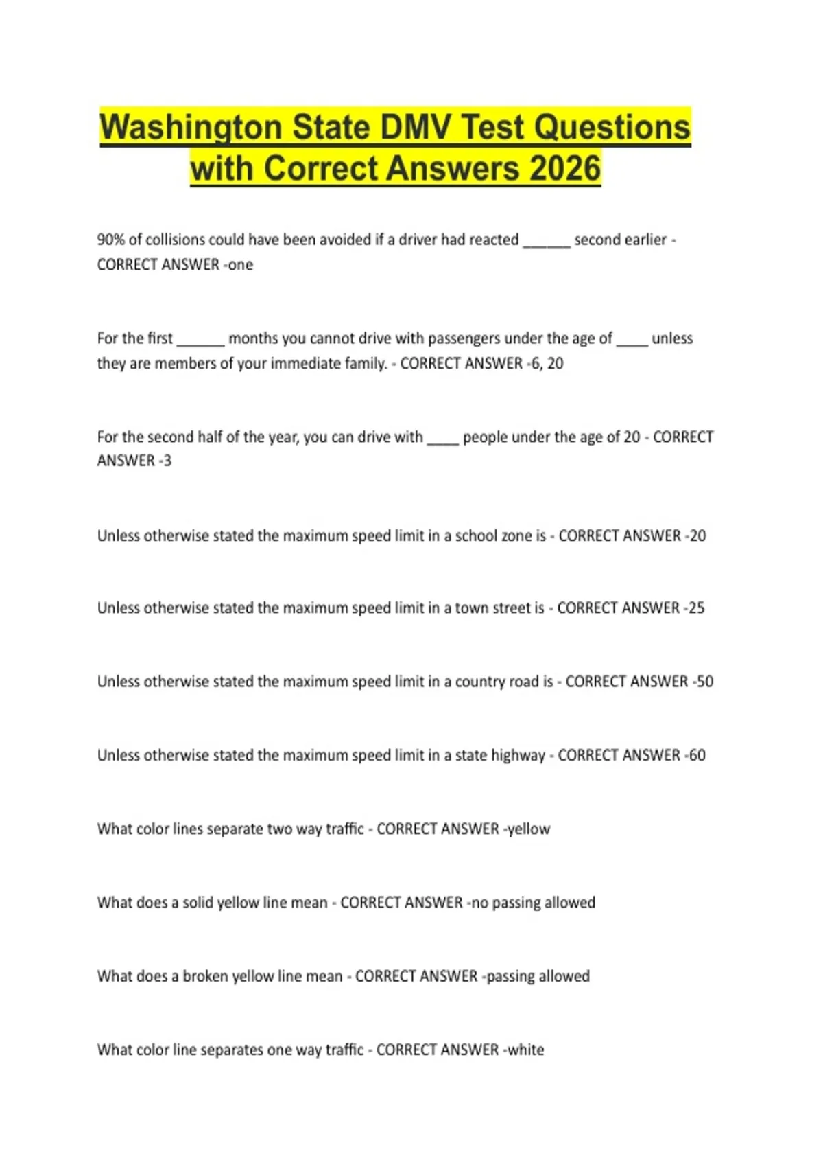 Washington State DMV Test Questions
