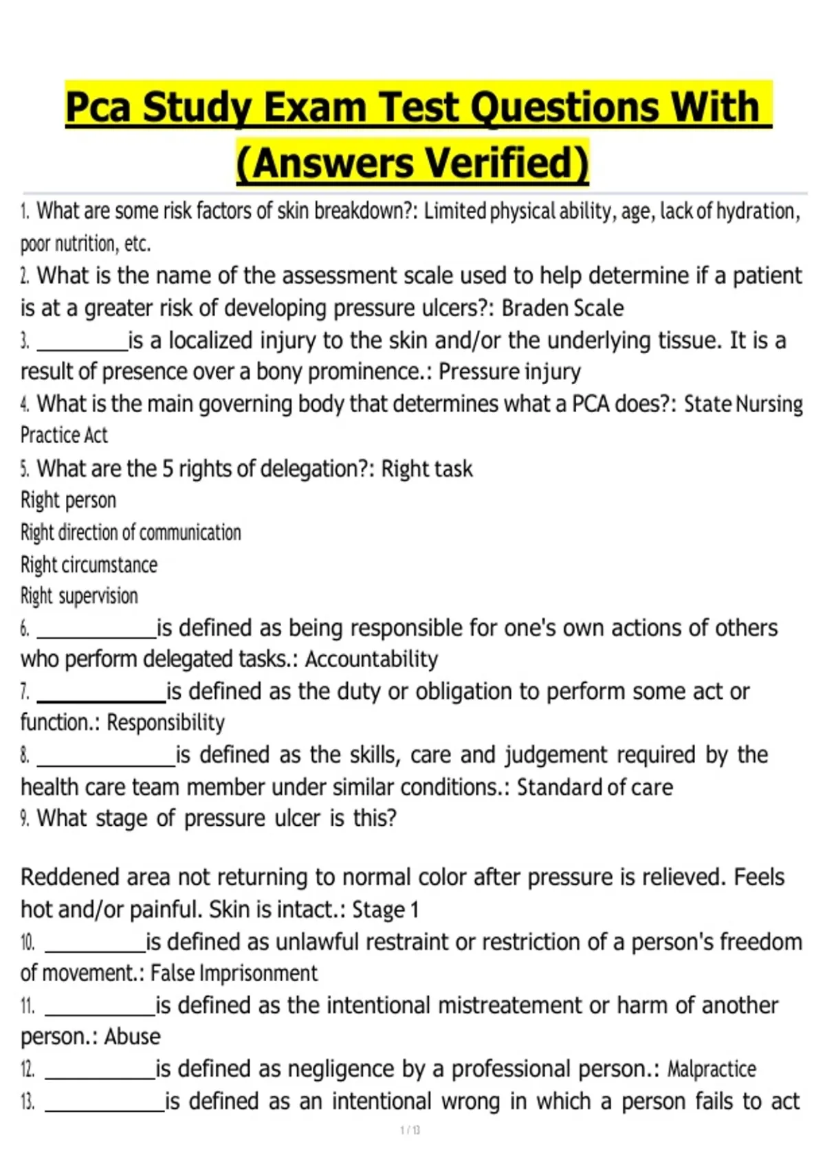 PCA STUDY GUIDE WITH VERIFIED ANSWERS