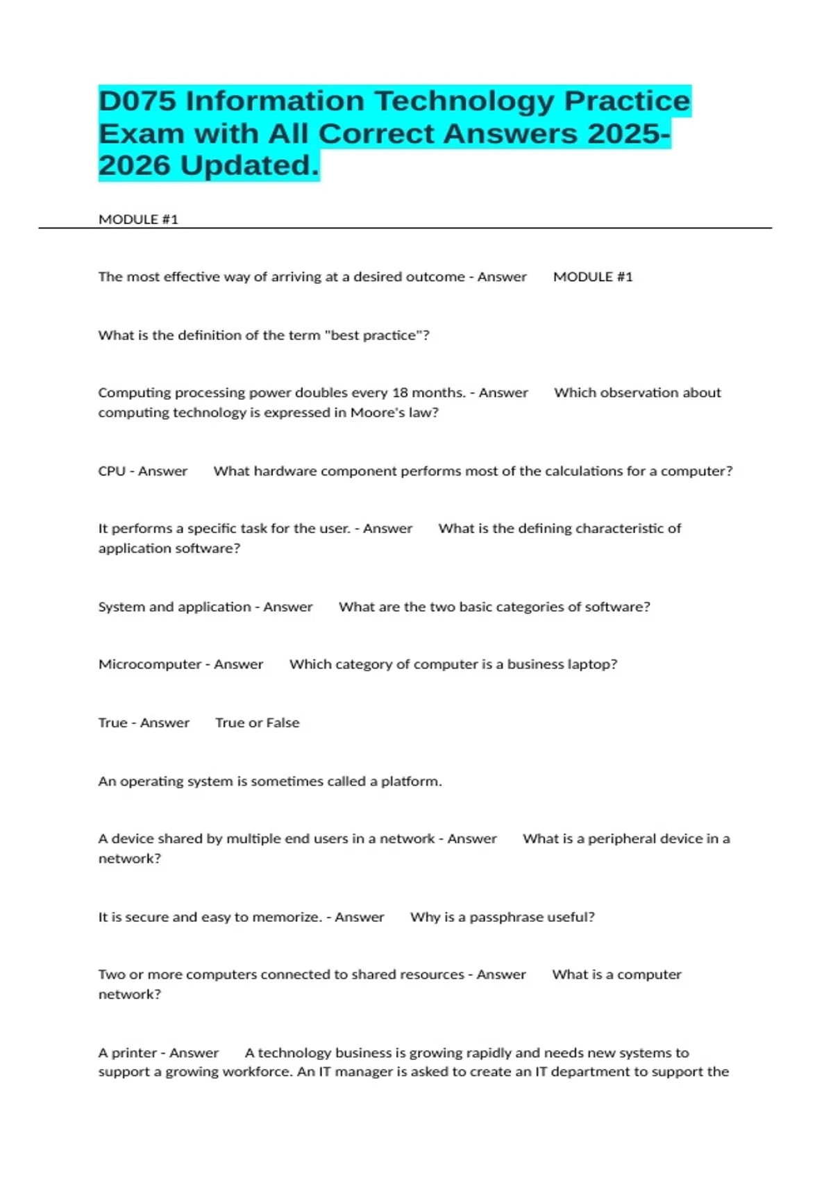 D075 Information Technology Practice Exam with All Correct Answers Updated.
