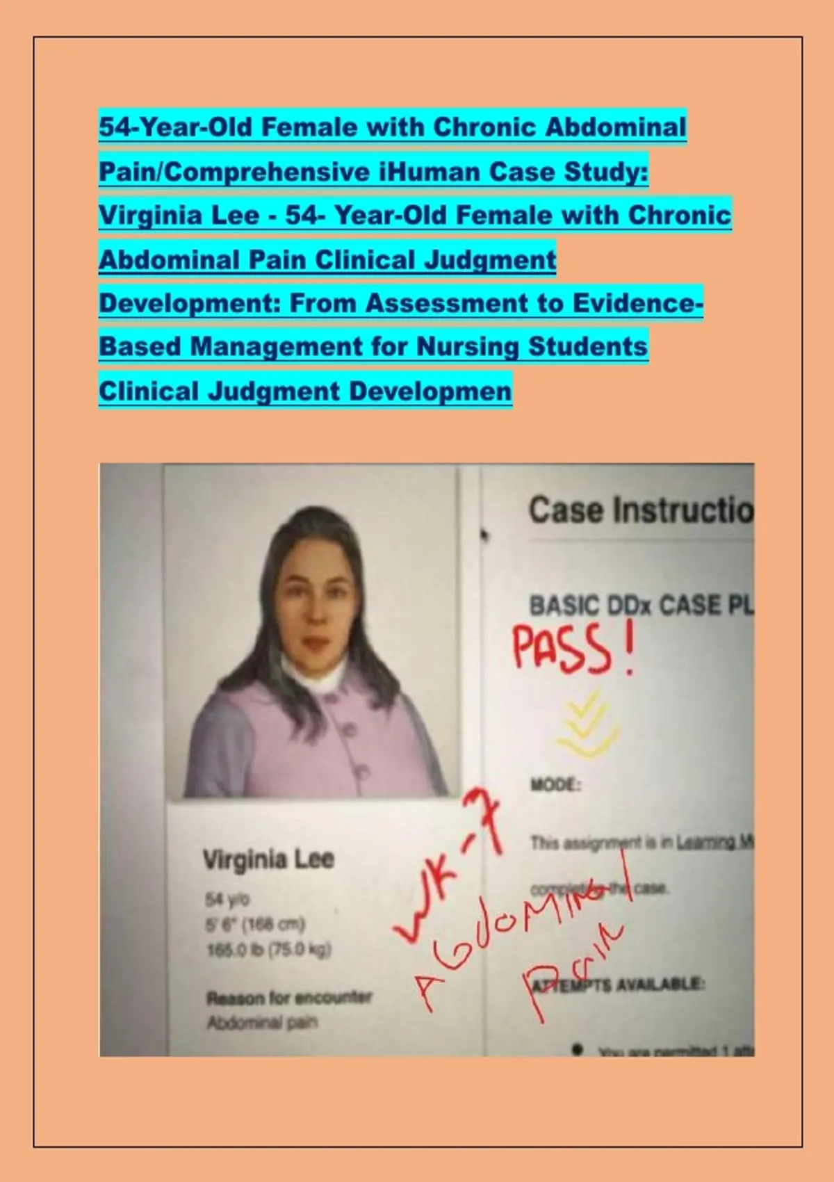 54-Year-Old Female with Chronic Abdominal Pain/Comprehensive iHuman Case Study: Virginia Lee - 54- Year-Old Female with Chronic Abdominal Pain Clinical Judgment Development: From Assessment to EvidenceBased Management for Nursing Students Clinical Judgment Developmen