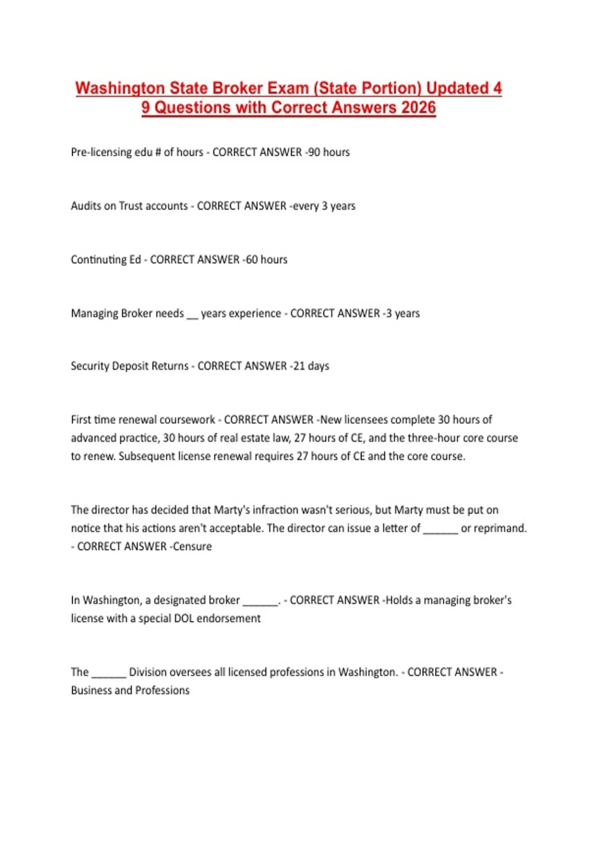 Washington State Broker Exam (State Portion) Updated 4 9 Questions with Correct Answers 2026 Washington State Broker Exam (State Portion) Updated 4 9 Questions with Correct Answers 2026