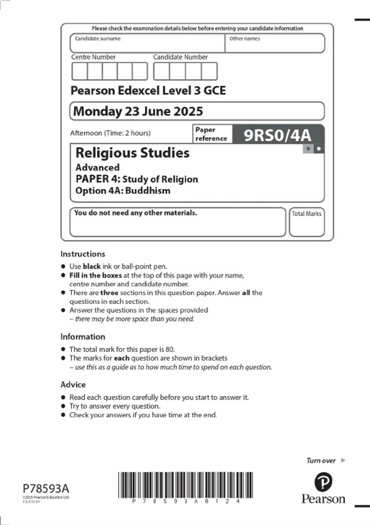 Pearson Edexcel Level 3 GCE Religious Studies Advanced PAPER 4: Study of Religion Option 4A: Buddhism JUNE 2025 combined Question Paper and Mark scheme