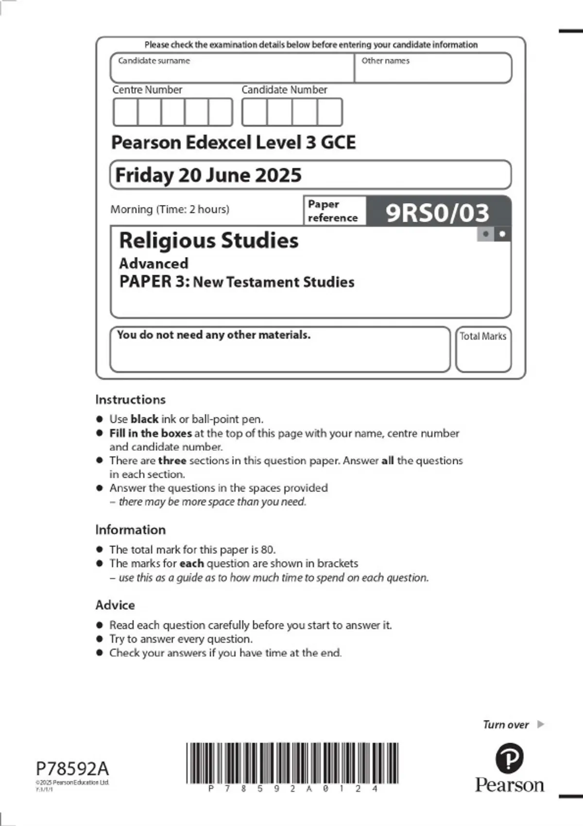 Pearson Edexcel Level 3 GCE Religious Studies Advanced PAPER 3: New Testament Studies JUNE 2025 combined Question Paper and Mark scheme
