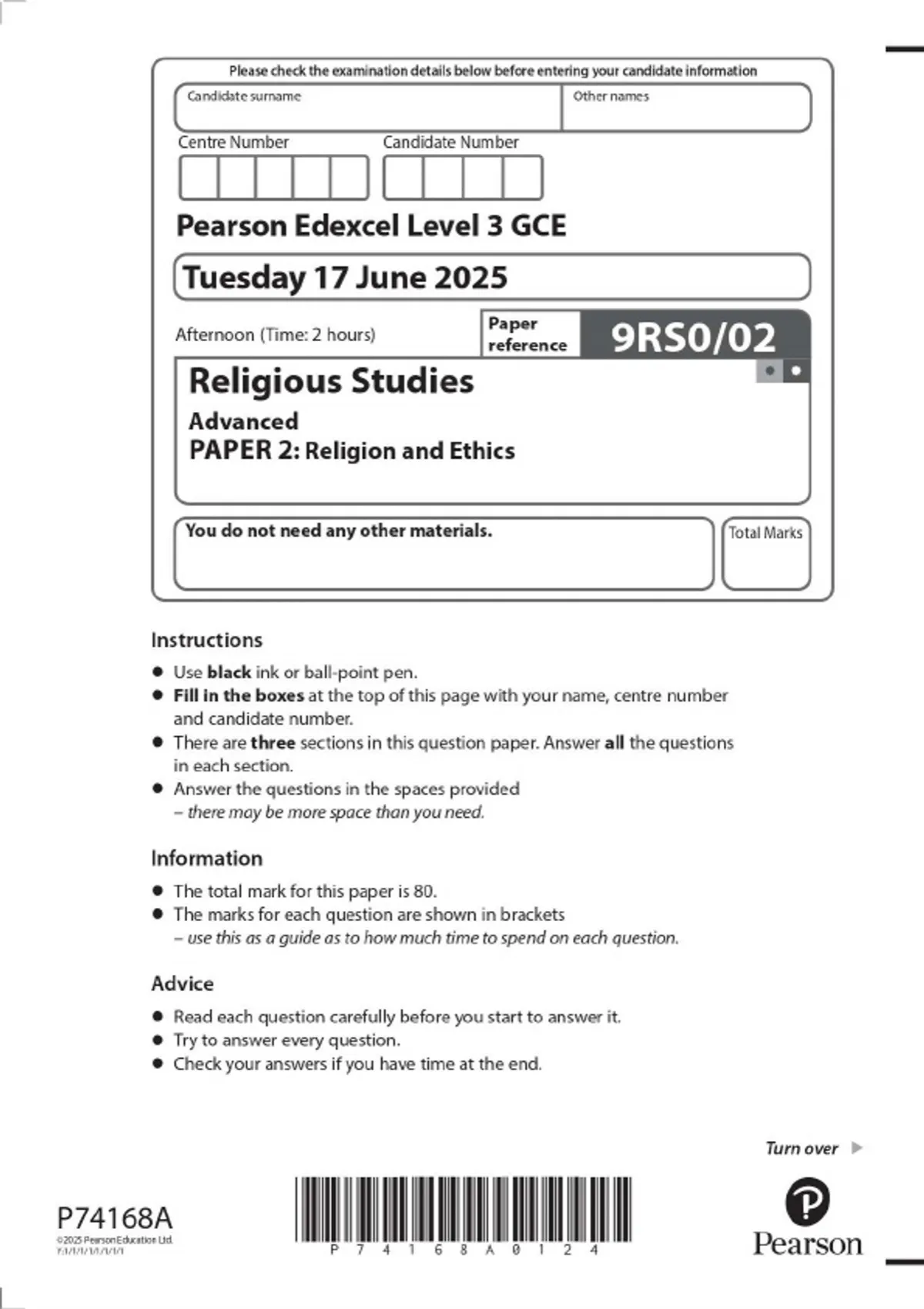Pearson Edexcel Level 3 GCE Religious Studies Advanced PAPER 2: Religion and Ethics JUNE 2025 combined Question Paper and Mark scheme