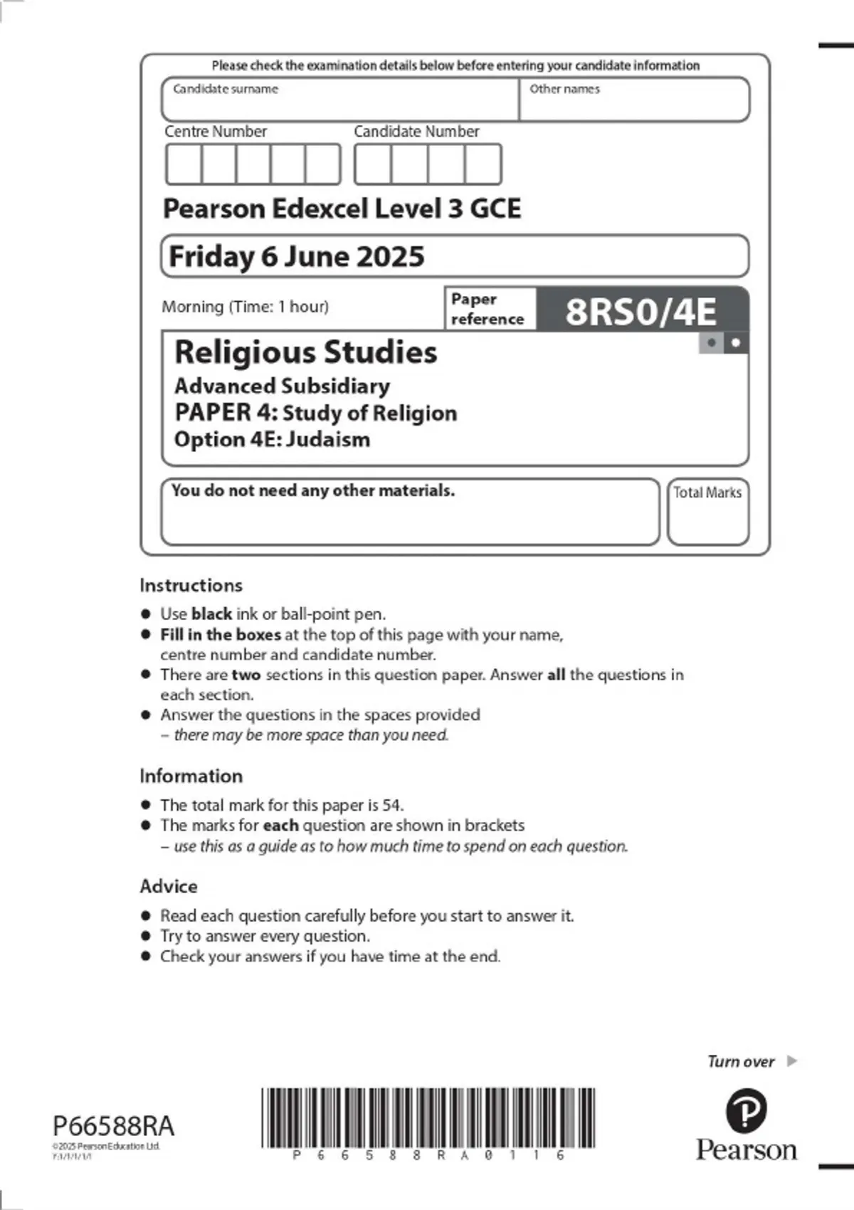 Pearson Edexcel Level 3 GCE Religious Studies Advanced Subsidiary PAPER 4: Study of Religion Option 4E: Judaism JUNE 2025 combined Question Paper and Mark scheme