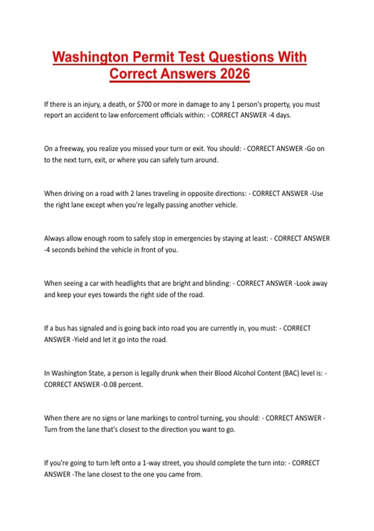Washington Permit Test Questions With Correct Answers 2026 Washington Permit Test Questions With Correct Answers 2026