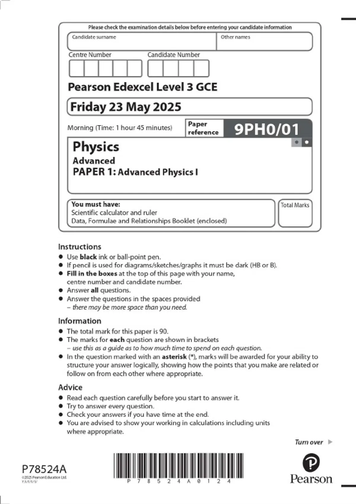 Pearson Edexcel Level 3 GCE Physics Advanced PAPER 1: Advanced Physics I MAY 2025 Combined Question Paper and Mark Scheme