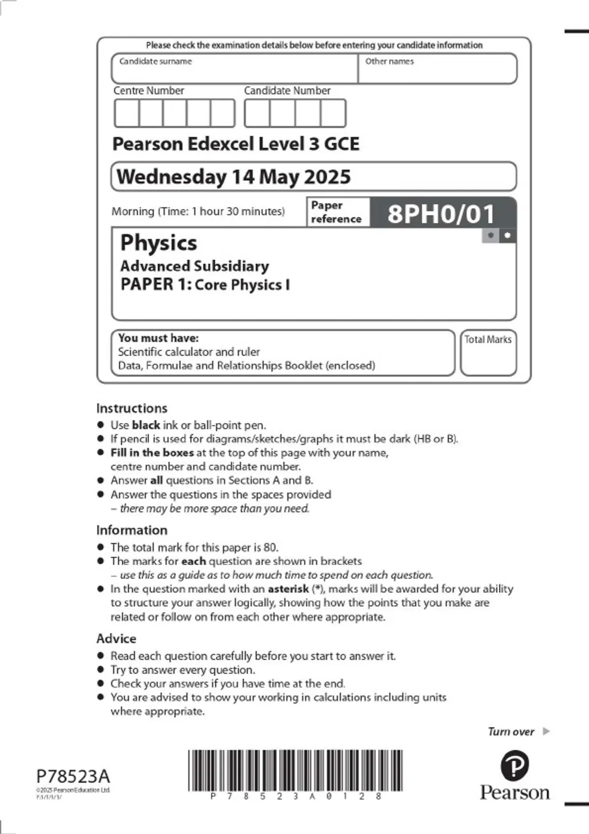 Pearson Edexcel Level 3 GCE Physics Advanced Subsidiary PAPER 1: Core Physics I MAY 2025 Combined Question Paper and Mark Scheme