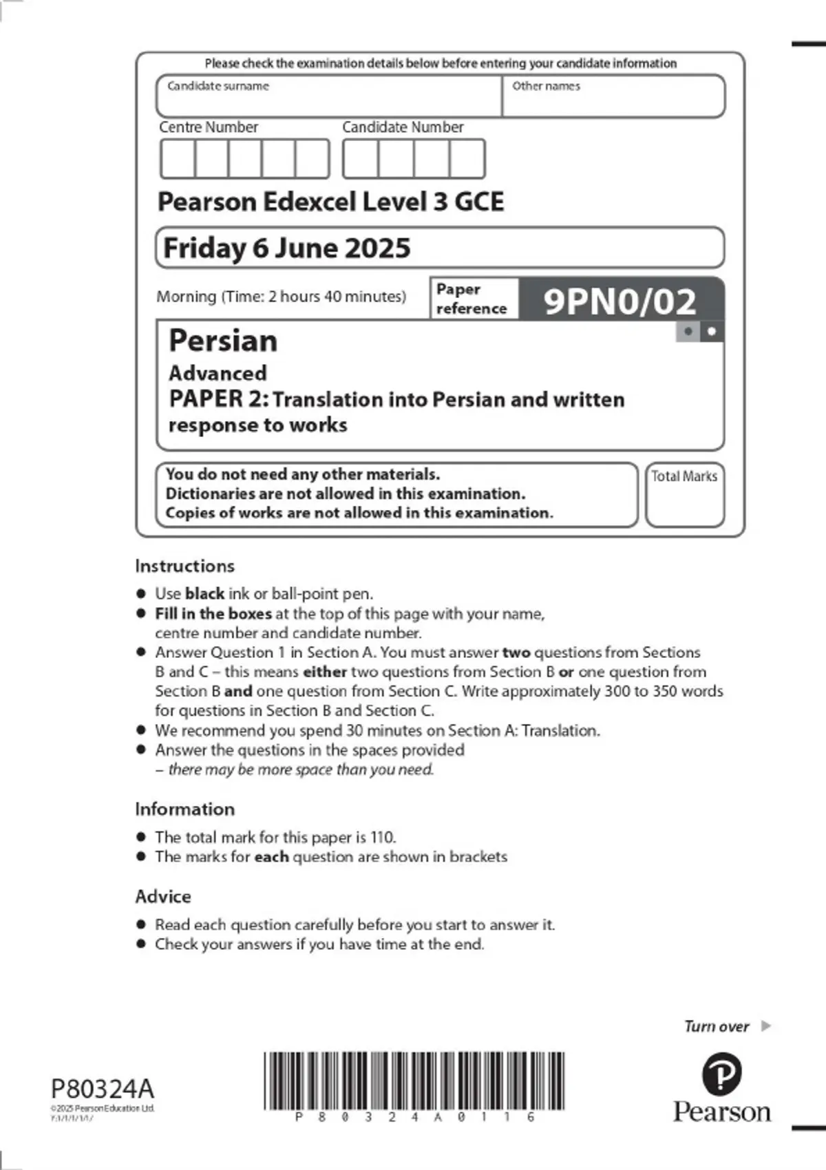 Pearson Edexcel Level 3 GCE Persian Advanced PAPER 2: Translation into Persian and written response to works JUNE 2025 Combined Question Paper and Mark Scheme