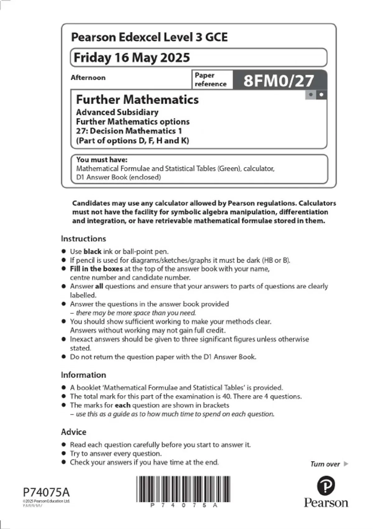 Pearson Edexcel Level 3 GCE Further Mathematics Advanced Subsidiary Further Mathematics options 27: Decision Mathematics 1 (Part of options D, F, H and K) MAY 2025 Combined Question Paper and Mark Scheme