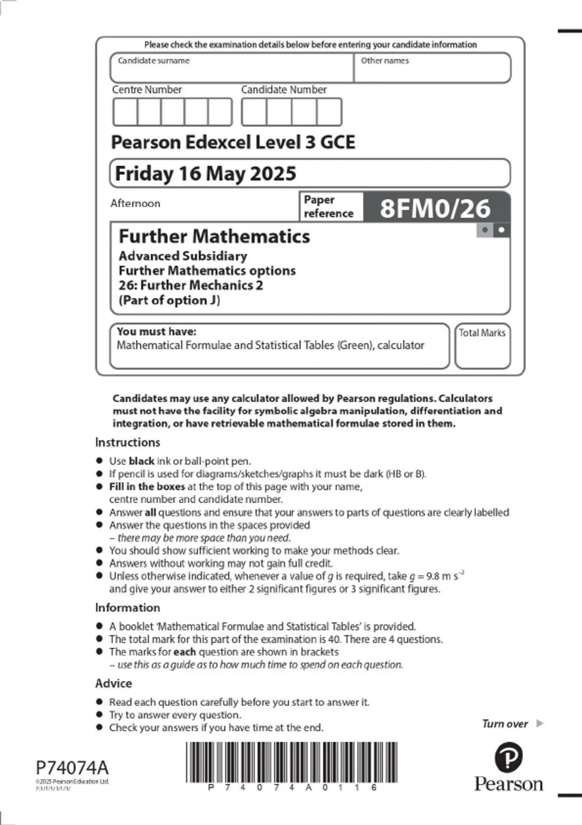 Pearson Edexcel Level 3 GCE Further Mathematics Advanced Subsidiary Further Mathematics options 26: Further Mechanics 2 (Part of option J) MAY 2025 Combined Question Paper and Mark Scheme