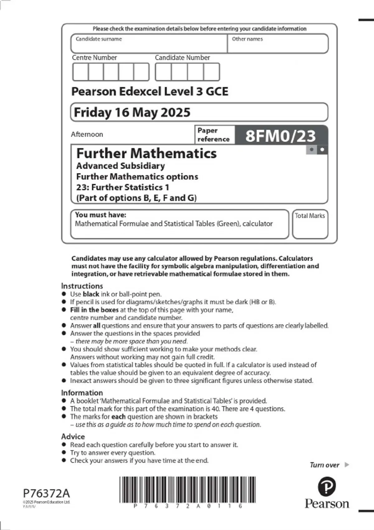 Pearson Edexcel Level 3 GCE Further Mathematics Advanced Subsidiary Further Mathematics options 23: Further Statistics 1 (Part of options B, E, F and G) MAY 2025 Combined Question Paper and Mark Scheme