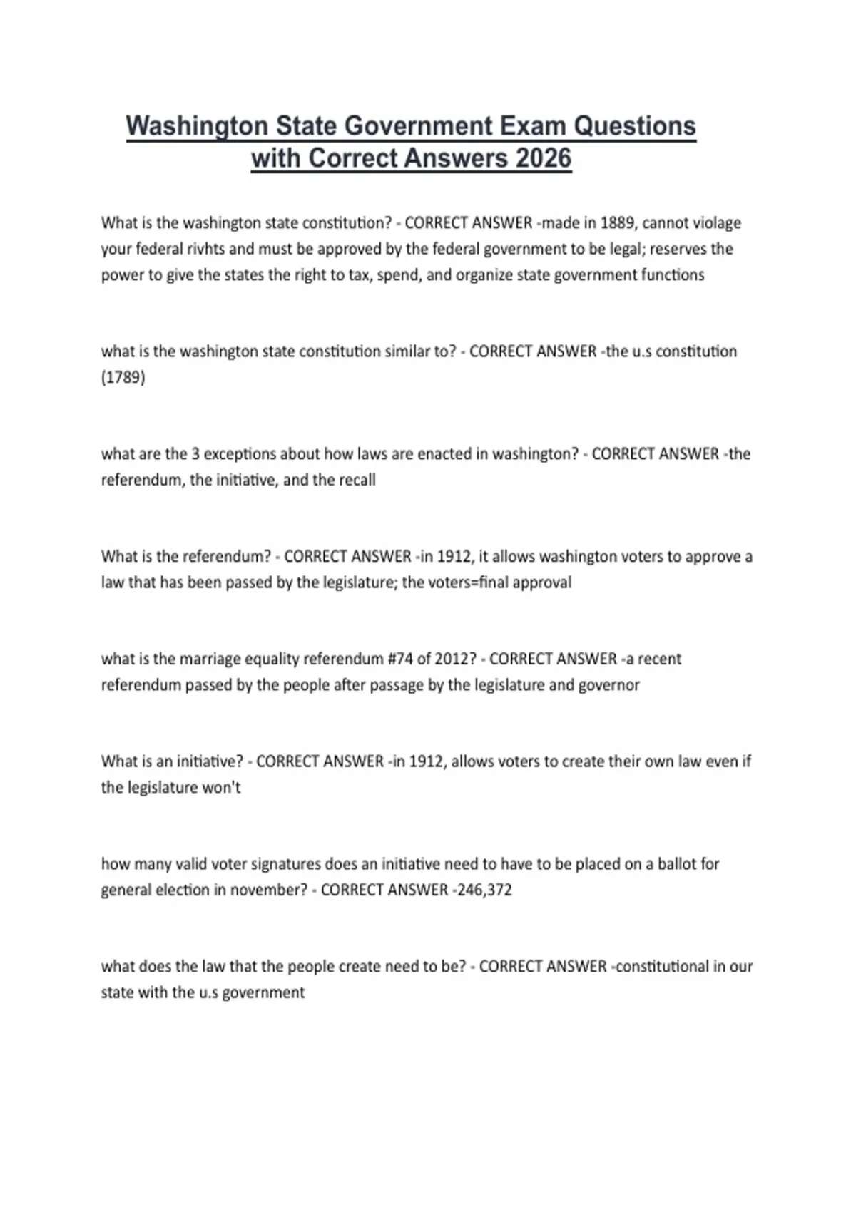 Washington State Government Exam Questions with Correct Answers 2026