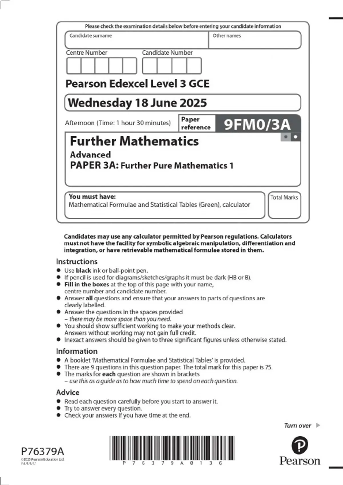 Pearson Edexcel Level 3 GCE Further Mathematics Advanced PAPER 3A: Further Pure Mathematics 1 JUNE 2025 Combined Question Paper and Mark Scheme