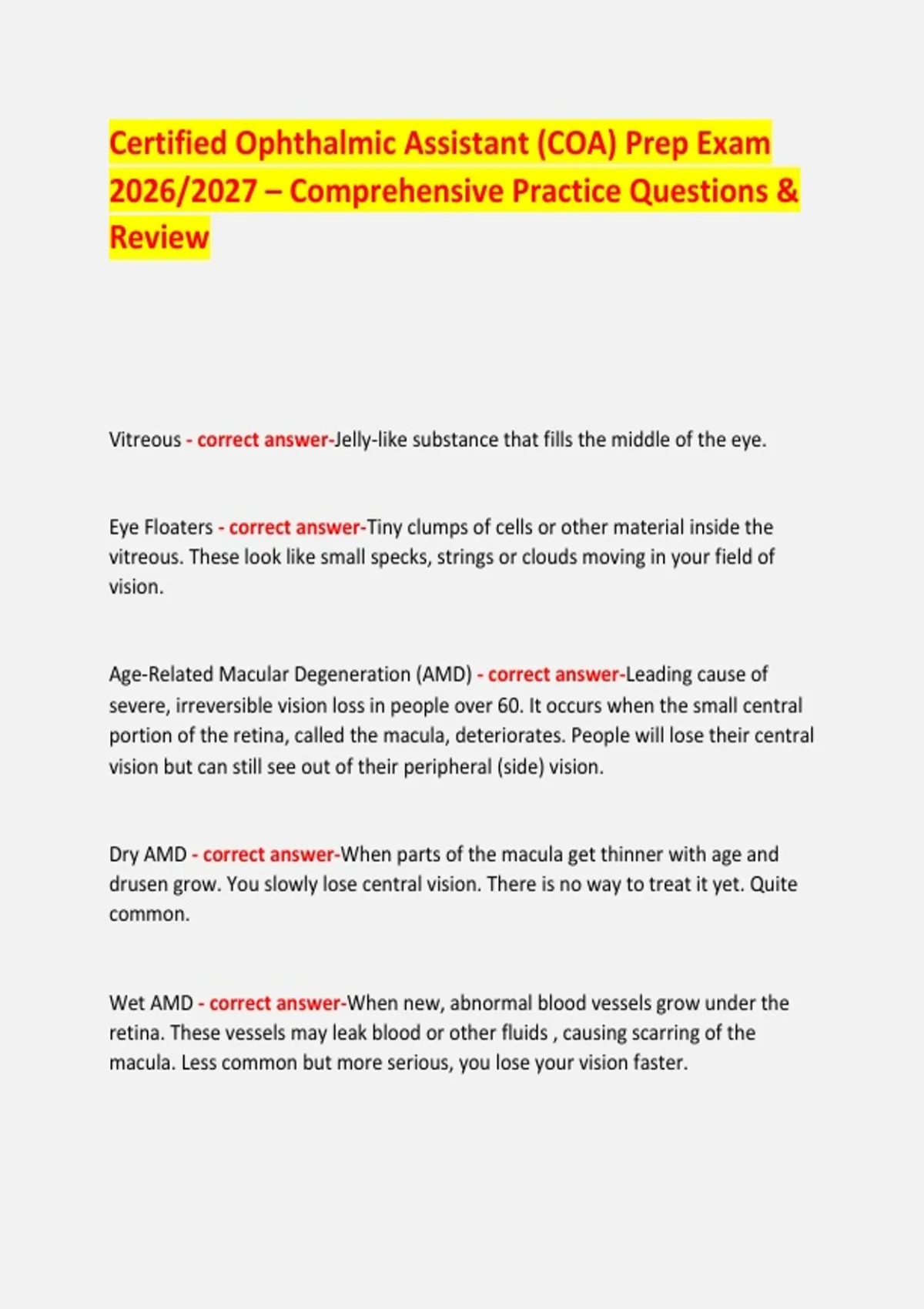 Certified Ophthalmic Assistant (COA) Exam 2026/2027 | Full Test Bank, Practice Exams & Detailed Rationales