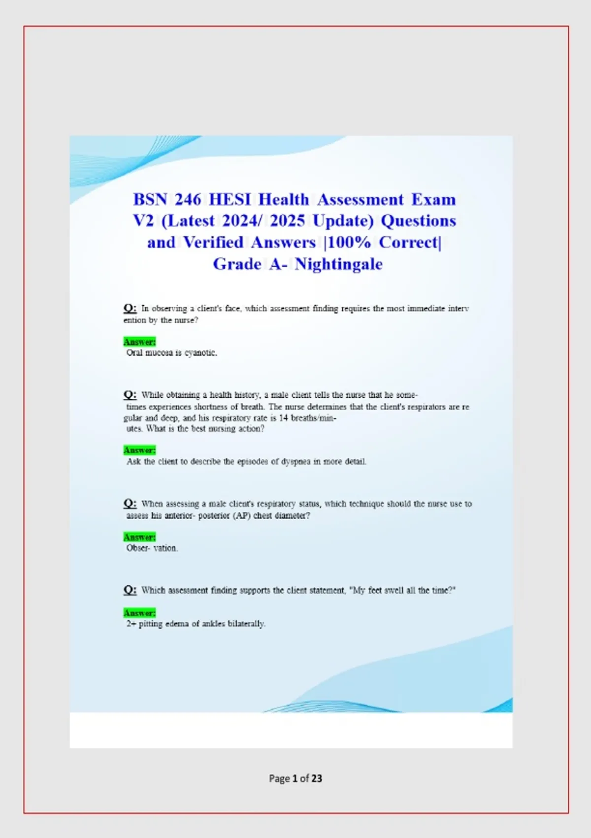 This comprehensive Nursing Health Assessment Test Bank is fully updated for 2026 and designed for nursing students preparing for exams, clinicals, or the NCLEX. It contains 100+ practice questions with detailed rationales covering essential physical assessment skills and findings, including: Cranial nerve assessment & neurological exam Respiratory, cardiovascular, and abdominal assessment Peripheral vascular and skin integrity evaluation Musculoskeletal and sensory testing Focused assessments (e.g., edema, ulcers, dehydration, perfusion) Documentation and clinical judgment scenarios Special populations (geriatric, prenatal, post-op) All answers are verified and explained to reinforce critical thinking and application. Ideal for nursing programs, ATI/HESI review, and self-study. This digital test bank is formatted for easy navigation, mobile-friendly, and instantly downloadable—help you master health assessment and pass your exams with confidence. Nursing health assessment test bank 2026 NCLEX health assessment questions Physical assessment nursing exam Cranial nerve exam test questions Nursing clinical skills test bank Health assessment NCLEX practice Nursing physical exam questions Focused assessment nursing test Edema assessment nursing questions Nursing school assessment test bank 2026