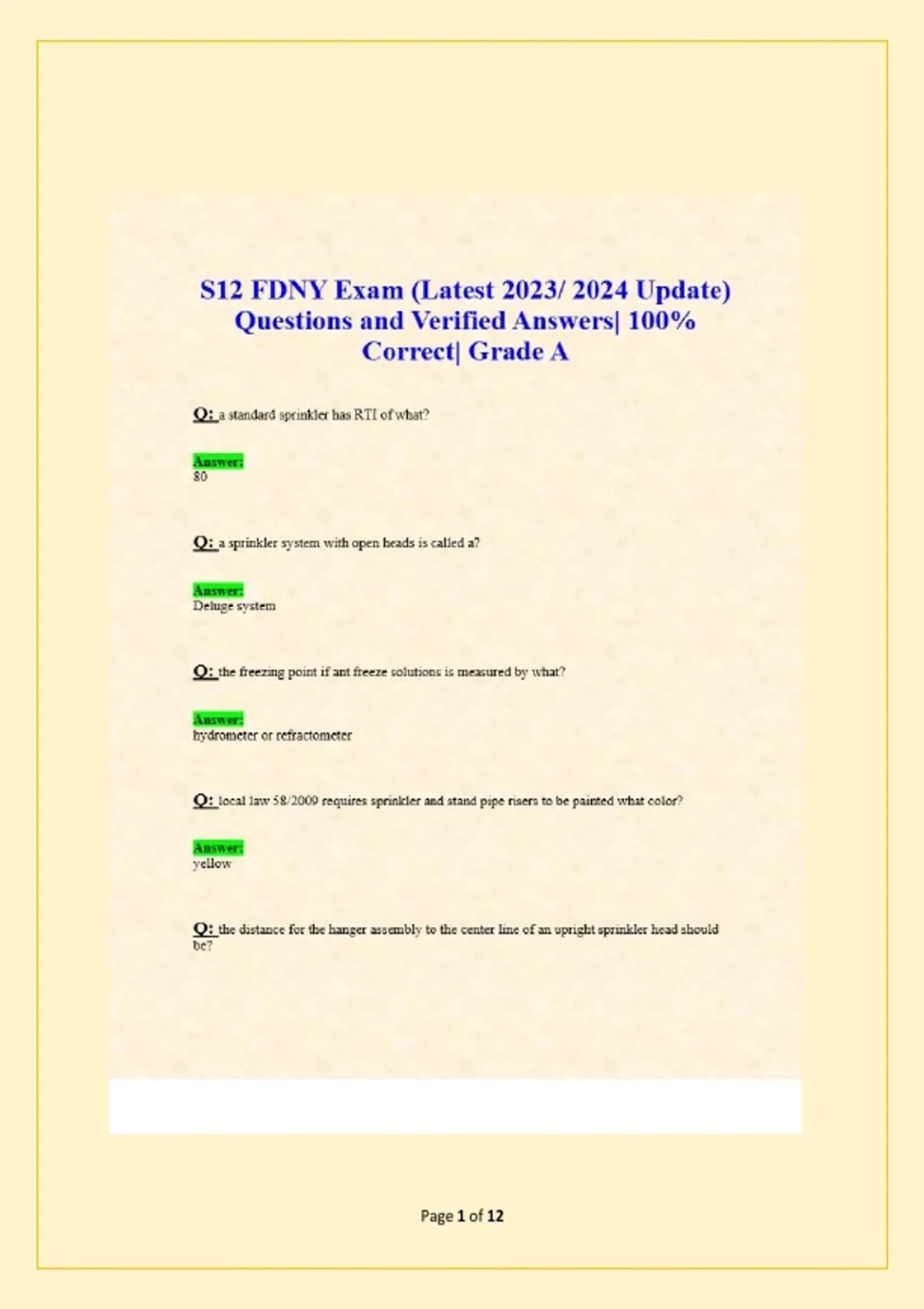 2026 FDNY S12/S15 Exam Prep | Fire Sprinkler Systems Test Bank | 100+ Questions & Verified Answers | RTI, Hydraulics, Codes, Inspections, Maintenance