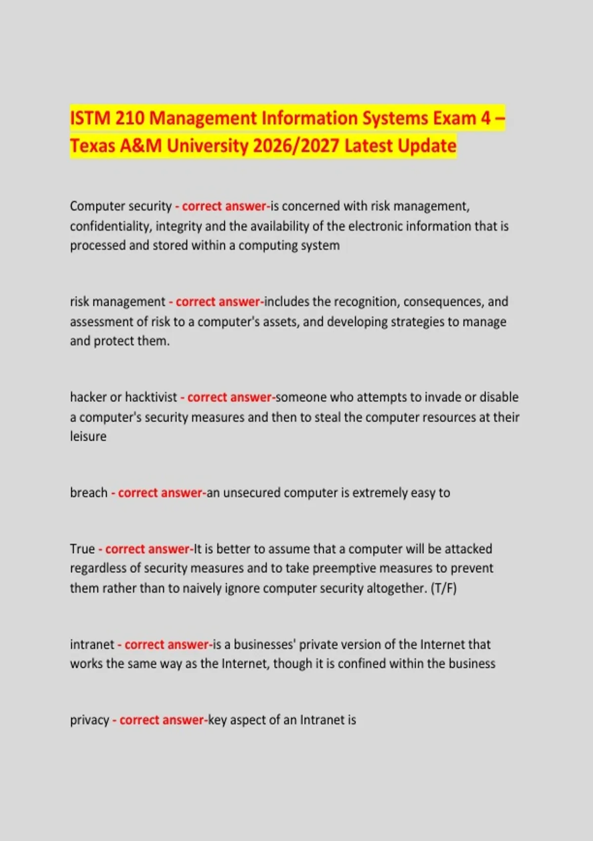 ISTM 210 Management Information Systems Exam 4 – Texas A&M University 2026/2027 Latest Update