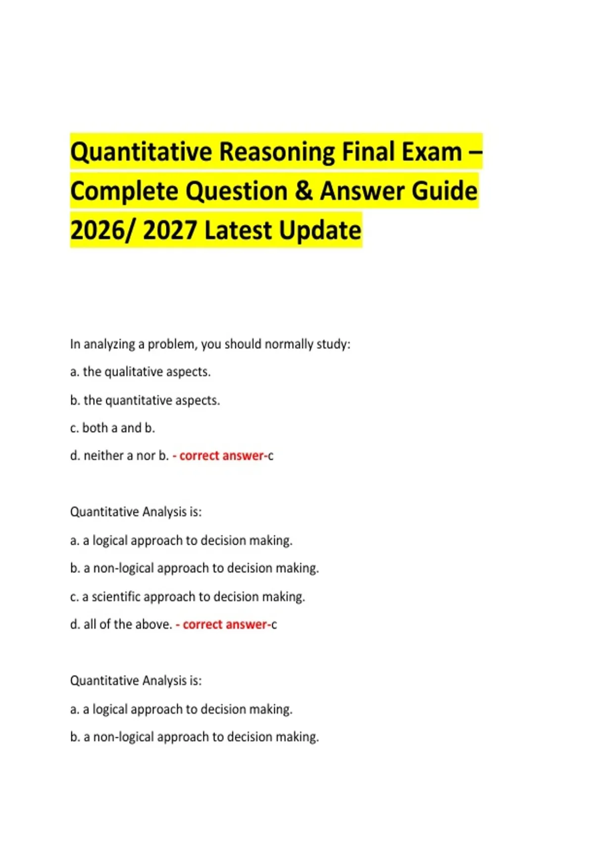 Quantitative Reasoning Final Exam – Complete Question & Answer Guide 2026/ 2027 Latest Update