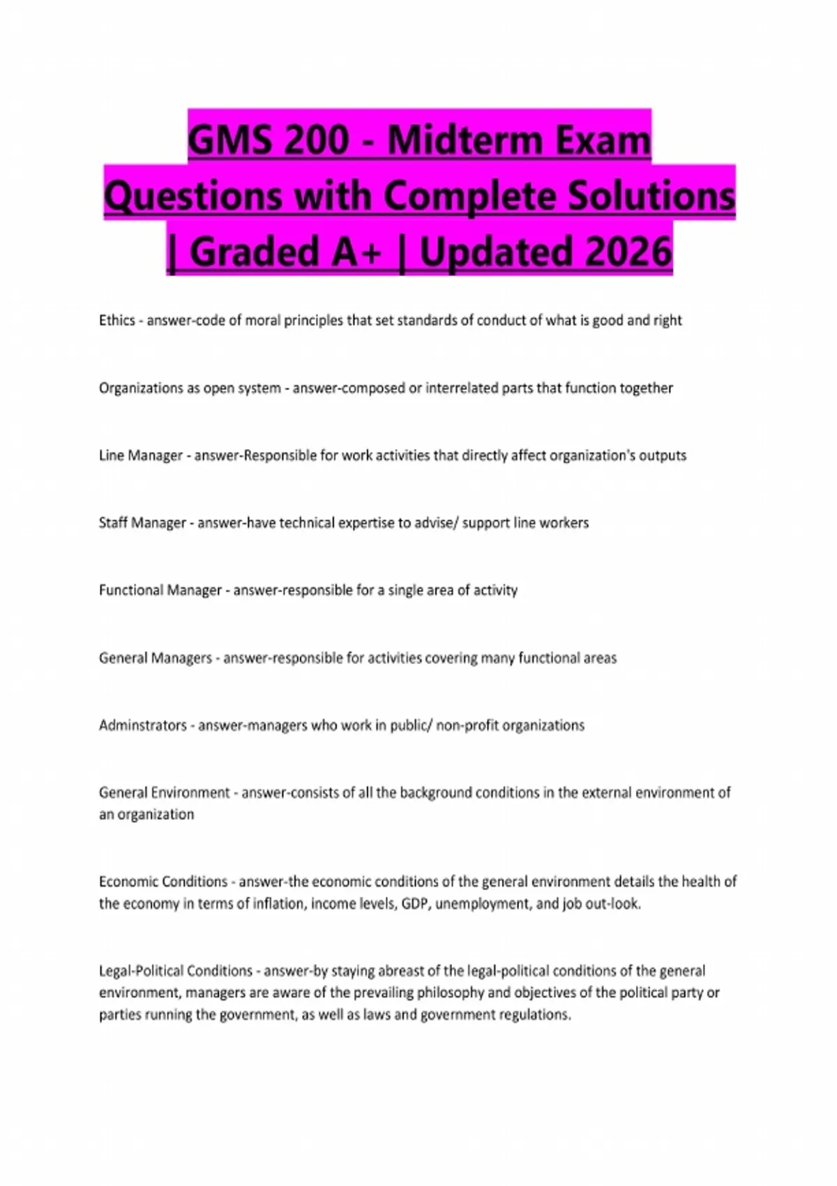 GMS 200 - Midterm Exam Questions with Complete Solutions | Graded A+ | Updated 2026 Ethics - answer-code of moral principles that set standards of conduct of what is good and right Organizations as open system - answer-composed or interrelated parts that function together Line Manager - answer-Responsible for work activities that directly affect organization's outputs Staff Manager - answer-have technical expertise to advise/ support line workers Functional Manager - answer-responsible for a single area of activity General Managers - answer-responsible for activities covering many functional areas Adminstrators - answer-managers who work in public/ non-profit organizations General Environment - answer-consists of all the background conditions in the external environment of an organization Economic Conditions - answer-the economic conditions of the general environment details the health of the economy in terms of inflation, income levels, GDP, unemployment, and job out-look. Legal-Political Conditions - answer-by staying abreast of the legal-political conditions of the general environment, managers are aware of the prevailing philosophy and objectives of the political party or parties running the government, as well as laws and government regulations.Internet Censorship - answer-is the deliberate blockage and denial of public access to information posted on the Internet Technological Conditions - answer-with the development and availability of new technologies in the general environment, managers need to constantly monitor how these advances affect the work being done by employees. Socio-cultural Conditions - answer-changes in the norms, customs, and social values on such matters as human rights, ethics, gender roles, and life styles, along with environmental trends in education and related social institutions, as well as demographic patterns all will affect how organizations are managed. Specific Environment - answer-consists of all the actual organizations, groups, and persons with whom an organization interacts and conducts business. Stakeholders - answer-the persons, groups, and institutions who are affected by the organization's performance Competitive Advantage - answer-refers to a core competency that clearly sets and organization apart from competitors and gives it an advantage over them in the marketplace Cost - answer-operating with lower costs than one's competitors and thus earning profits with prices that competitors have difficulty matching Quality - answer-creating products and services that are demonstrably higher quality for customers than what is being offered by the competition Delivery - answer-outperforming competitors by delivering products and services to customers faster and on-time, while continuing to develop timely new products Flexibility - answer-adjusting and tailoring products and services to fit customer needs in ways that are difficult for competitors to matchStrategic Positioning - answer-occurs when an organization does different things or the same thing in different ways from its major competitors Environmental Uncertainty - answer-means that there is a lack of complete information regarding what exists and what developments may occur in the external environment Planning - answer-set performance objectives & deciding how to achieve them Organizing - answer-arranging tasks, people & other resources to accomplish the work Leading - answer-inspiring people to work hard to achieve high performance Controlling - answer-measuring performance & taking action to ensure desired results Human Skills - answer-ability to work well in cooperation with other people Technical Skills - answer-it is learned through education and then refined through training and experience Scientific Management - answer-principal object of management should be securing maximum prosperity for employer and employee ( how can things be done more efficiently) Division of Labour - answer-specialization of work Discipline - answer-rules that workers follow Unity of Command - answer-report to one boss in an organization Remuneration - answer-FairnessCentralization - answer-decisions are made from the top Equity - answer-Kind and fair Bureaucracy - answer-based on principles of logic, order, and legitimate authority Hawthorne Studies - answer-examined how economic incentives and physical conditions affected worker output Physiological Needs - answer-Food, water, warmth, rest Safety Needs - answer-Security and Safety Belongingness and love needs - answer-Intimate relationships, friends Esteem Needs - answer-prestige and feeling of accomplishment Self Actualization Needs - answer-achieving one's full potential, including creative activities Theory X - answer-assumes that workers: -dislike work -lack ambition -are irresponsible Theory Y - answer-assumes that workers: -willing to work -willing to accept responsibility -capable of self direction