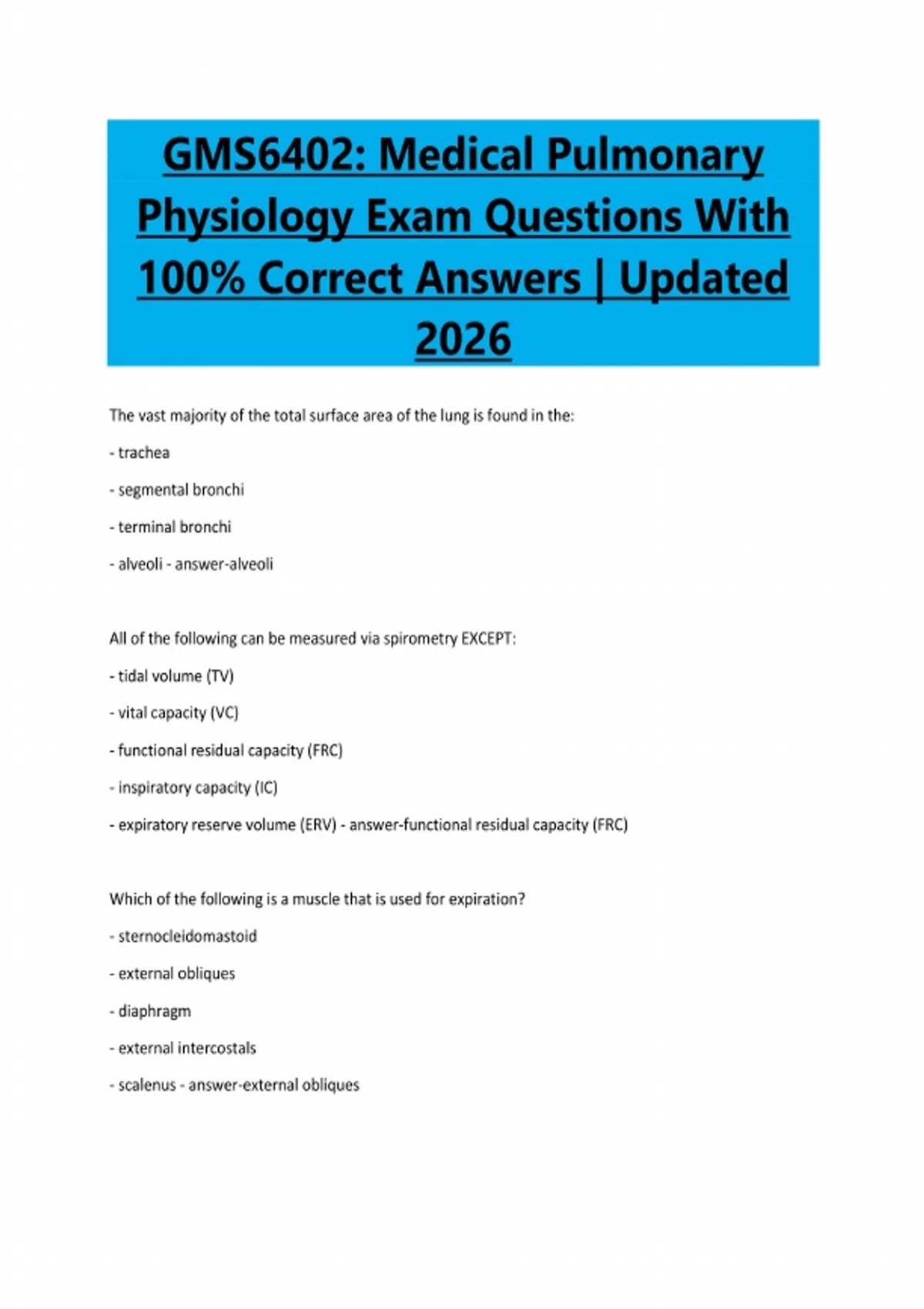 GMS6402: Medical Pulmonary Physiology Exam Questions With 100% Correct Answers | Updated 2026 The vast majority of the total surface area of the lung is found in the: - trachea - segmental bronchi - terminal bronchi - alveoli - answer-alveoli All of the following can be measured via spirometry EXCEPT: - tidal volume (TV) - vital capacity (VC) - functional residual capacity (FRC) - inspiratory capacity (IC) - expiratory reserve volume (ERV) - answer-functional residual capacity (FRC) Which of the following is a muscle that is used for expiration? - sternocleidomastoid - external obliques - diaphragm - external intercostals - scalenus - answer-external obliquesWhat is the Transpulmonary pressure (PTP) if pleural pressure is -7 cm H2O and alveolar pressure is -3 cm H2O? - +10 cm H2O - +4 cm H2O - -10 cm H2O - -4 cm H2O - 0 cm H2O - answer-+4 cm H2O A lung compliance test indicates that a 3 cm H2O change in transpulmonary pressure generates a 0.9 liter change in lung volume. What is this patient's lung compliance? - 0.2 liters of air/cm H2O - 0.2 cm H2O/liter of air - 3.33 cm H2O/liter of air - 0.3 liters of air/cm H2O - 2.7 liters of air/cm H2O - answer-0.3 liters of air/cm H2O Airway resistance across a set of airways is lowest under which of the following conditions? - airway radius is large and the length of the tube is large - airway radius is large and the length of the tube is small - airway radius is small and airways are in series. - airway radius is small and airways are in parallel. - airway radius is large and gas viscosity is increased - answer-airway radius is large and the length of the tube is small As the lungs fill with air and we move from a low lung volume to higher lung volumes, airway resistance will - increase linearly - decrease exponentially - increase exponentially - decrease linearly- all of the above - answer-decrease exponentially A patient performs an expiratory forced vital capacity maneuver. His FVC is 2 liters and his FEV1 is 1 liter. Based on your knowledge of these numbers you would predict that this person suffers from - a restrictive lung disease - pulmonary fibrosis - an obstructive lung disease - all of the above - this patient is normal - answer-an obstructive lung disease When at sea level and breathing room air, the partial pressure of O2 in inspired air is - 760 mm Hg - 40 mm Hg - 100 mm Hg - 160 mm Hg - 150 mm Hg - answer-150 mm Hg A patient begins to hyperventilate while sitting in a clinic on Miami Beach and breathing room air. Over the ensuing 1 minute, his PACO2 drops to 20 mm Hg. What is his PaO2 at that moment in time? - 150 mm Hg - 125 mm Hg - 100 mm Hg - 75 mm Hg - 50 mm Hg - answer-125 mm Hg With respect to the path of O2 diffusion, the proper order for the movement of oxygen across the pulmonary capillary membrane is - alveolar epithelium, interstitial space, blood, capillary basement membrane - interstitial space, alveolar epithelium, capillary basement membrane, blood - alveolar epithelium, blood, interstitial space, capillary basement membrane- alveolar epithelium, interstitial space, capillary basement membrane, blood - alveolar epithelium, capillary basement membrane, blood, interstitial space - answer-alveolar epithelium, interstitial space, capillary basement membrane, blood