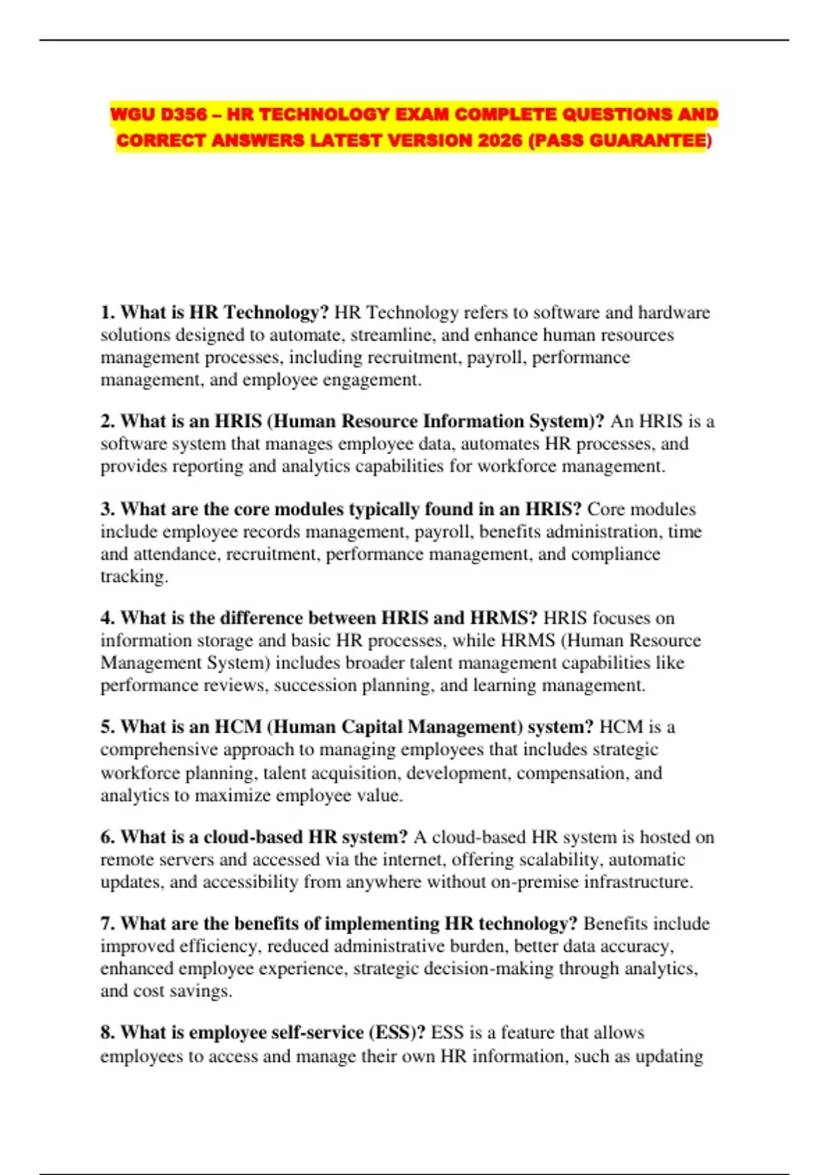 WGU D356 – HR TECHNOLOGY EXAM COMPLETE QUESTIONS AND CORRECT ANSWERS LATEST VERSION 2026 (PASS GUARANTEE)...
