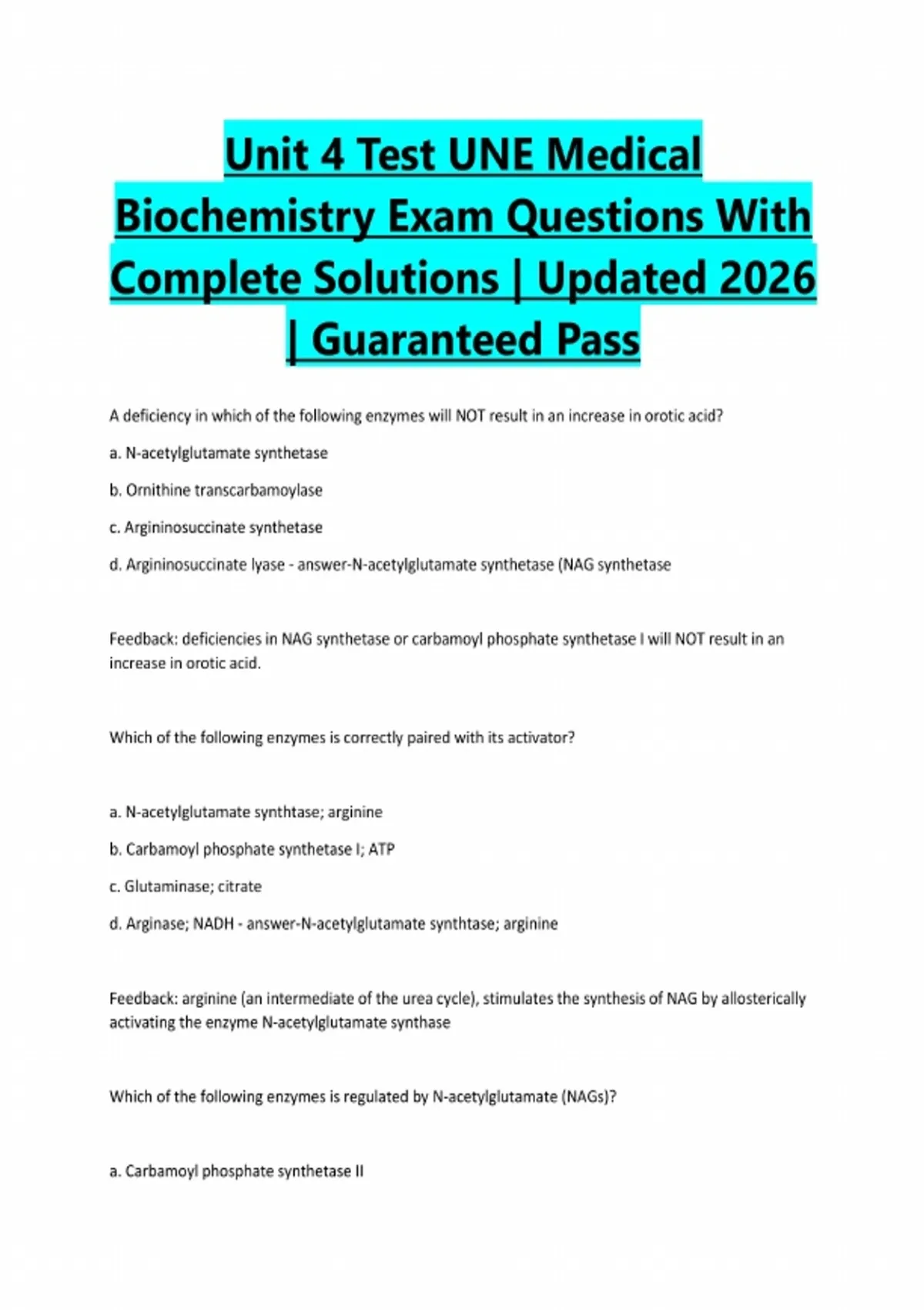 Unit 4 Test UNE Medical Biochemistry Exam Questions With Complete Solutions | Updated 2026 | Guaranteed Pass A deficiency in which of the following enzymes will NOT result in an increase in orotic acid? a. N-acetylglutamate synthetase b. Ornithine transcarbamoylase c. Argininosuccinate synthetase d. Argininosuccinate lyase - answer-N-acetylglutamate synthetase (NAG synthetase Feedback: deficiencies in NAG synthetase or carbamoyl phosphate synthetase I will NOT result in an increase in orotic acid. Which of the following enzymes is correctly paired with its activator? a. N-acetylglutamate synthtase; arginine b. Carbamoyl phosphate synthetase I; ATP c. Glutaminase; citrate d. Arginase; NADH - answer-N-acetylglutamate synthtase; arginine Feedback: arginine (an intermediate of the urea cycle), stimulates the synthesis of NAG by allosterically activating the enzyme N-acetylglutamate synthase Which of the following enzymes is regulated by N-acetylglutamate (NAGs)? a. Carbamoyl phosphate synthetase IIb. Ornithine transcarbamoylase c. Carbamoyl phosphate synthetase I d. Arginosuccinate lyase - answer-Carbamoyl phosphate synthetase I (CPS I) Feedback: CPS I is the regulatory enzyme of the urea cycle and is stimulated by NAG Your patient presents with a deficiency of the enzyme that catalyzes synthesis of N-acetylglutamate (NAGs). Which of the following will be a consequence of this deficiency in the patient? a. increased fatty acids in the blood b. increased amino acids in the blood c. decreased excretion of uric acid d. increased glucose in the blood - answer-Increased amino acids in the blood NAG is an essential activator of CPS I which catalyzes the first step in the urea cycle. Loss of this activator will decrease urea cycle activity, which will increase the amount of amino acids in the blood. The urea cycle takes place in which of the following subcellular locations? a. the cytosol and the mitochondria b. the cytosol only c. the nucleus and the mitochondria d. the mitochondria only - answer-the cytosol and the mitochondria Which of the following non-essential amino acids is synthesized as part of the urea cycle? a. Asparagine b. Aspartate c. Lysine d. Arginine e. Glutamine - answer-arginineSeveral amino acids are intermediates of the urea cycle, having side ammonia groups that join with free Co2 and ammonia to produce net excretion of ammonia as urea. Which of the following amino acids has a nitrogen in its side chain AND is an intermediate of the urea cycle? a. asparagine b. glutamate c. phenylalanine d. arginine - answer-arginine Which of the following reactions of the urea cycle takes place in the mitochondria? a. the synthesis of urea b. the synthesis of argininosuccinate c. the synthesis of carbamoyl phosphate d. the synthesis of arginine - answer-the synthesis of carbamoyl phosphate A 52-year-old male sought medical help complaining about a progressive appearance of hyperchromic papules on the edge of the second finger. Incisional biopsy of one of the spots on his hands and urine sample tested positive for homogentisic acid. Based on these findings a diagnosis of alkaptonuria is made. This diagnosis is consistent with a deficiency in which of the following enzymes? a. phenylalanine hydroxylase b. tyrosinase c. homogentisate oxidase d. α-ketoacid dehydrogenase - answer-homogentisate oxidase Which of the following best describes the process of transamination? a. the transfer of an amino group from an amino acid to a keto-acid b. the release of free ammonia from an amino acid c. the transfer of a carboxyl group to a keto acid - answer-the transfer of an amino group from an amino acid to a keto acid