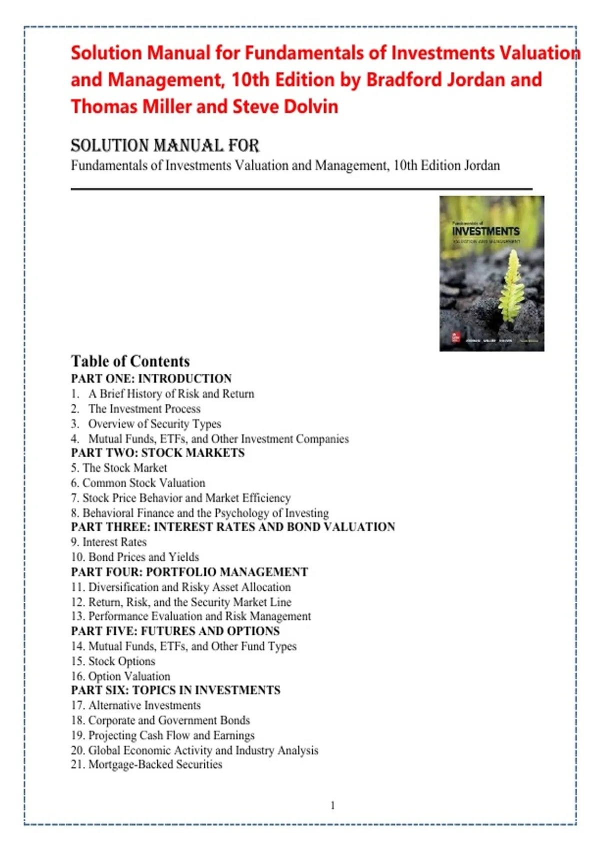 Fundamentals of Investments Valuation and Management, 10th Edition Jordan