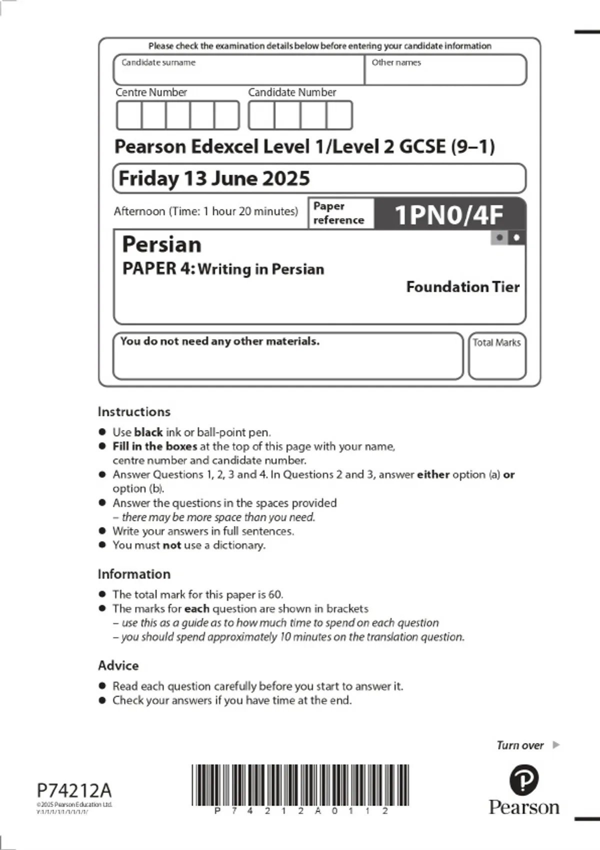 2025 Pearson Edexcel Level 1/Level 2 GCSE (9–1) Persian PAPER 4: Writing in Persian Foundation Tier Combined Question Paper and Marking Scheme2025 Pearson Edexcel Level 1/Level 2 GCSE (9–1) Persian PAPER 4: Writing in Persian Foundation Tier Combined Qu