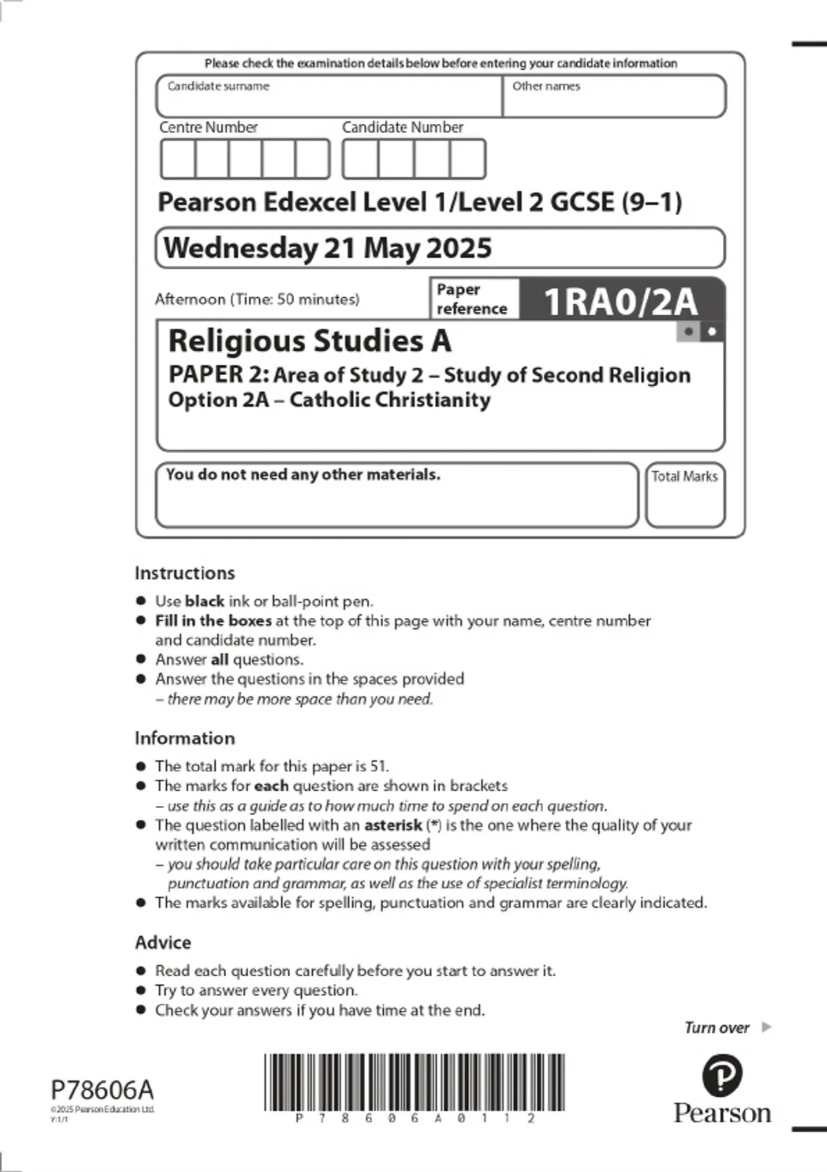 2025 Pearson Edexcel Level 1/Level 2 GCSE (9–1) Religious Studies A PAPER 2: Area of Study 2 – Study of Second Religion Option 2A – Catholic Christianity Combined Question Paper and Marking Scheme