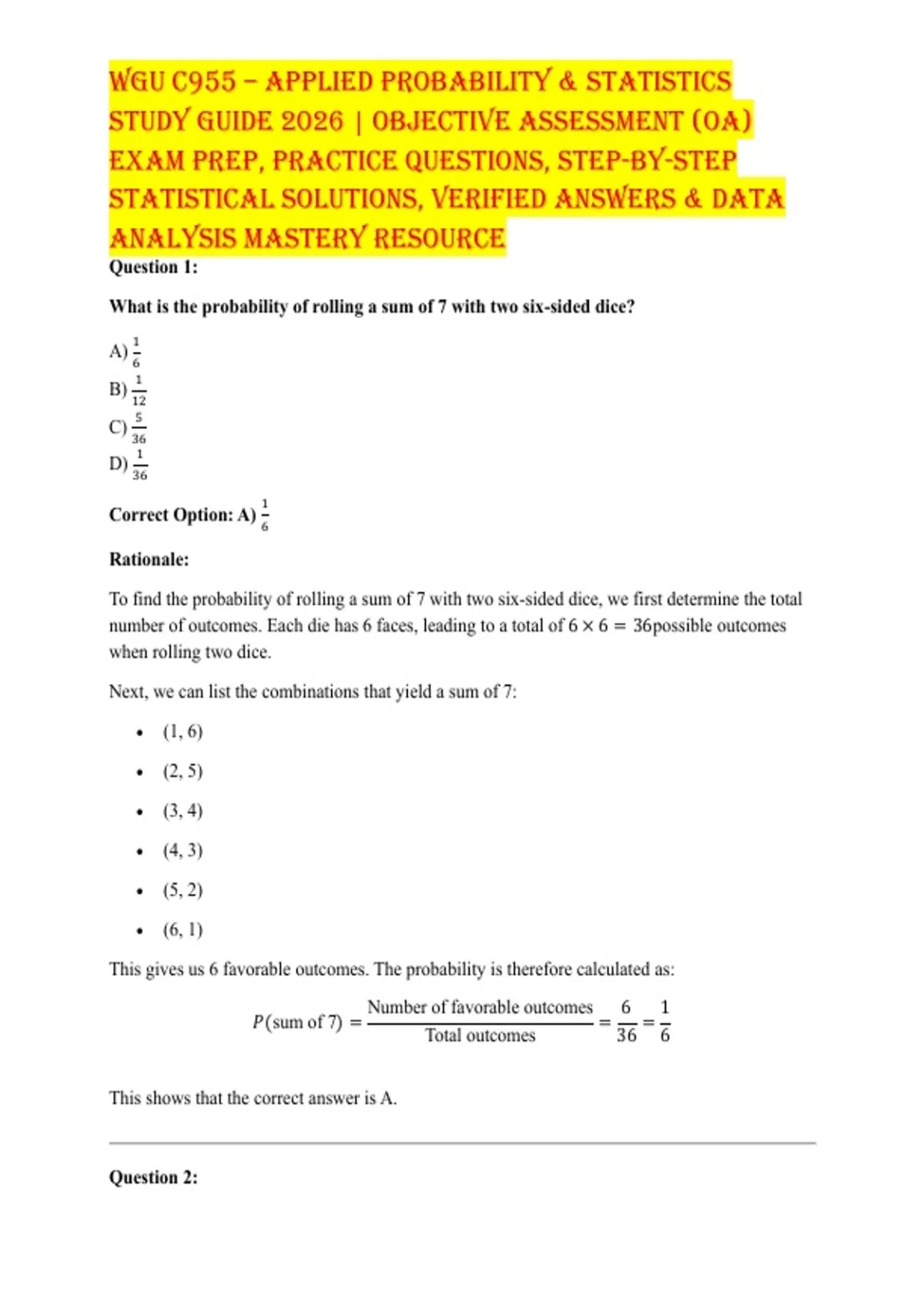 WGU C955 – Applied Probability & Statistics Study Guide 2026 | Objective Assessment (OA) Exam Prep, Practice Questions, Step-by-Step Statistical Solutions, Verified Answers & Data Analysis Mastery Resource