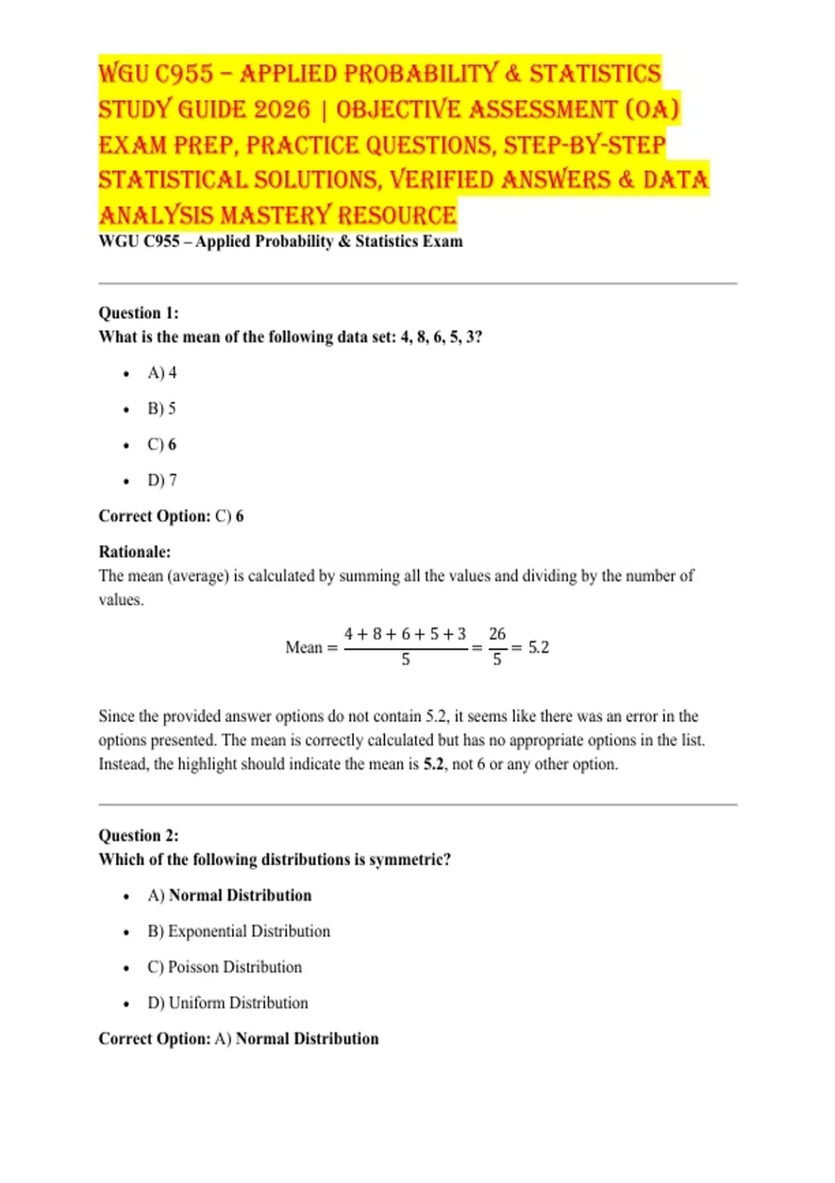 Instead, the highlight should indicate the mean is 5.2, not 6 or any other option.