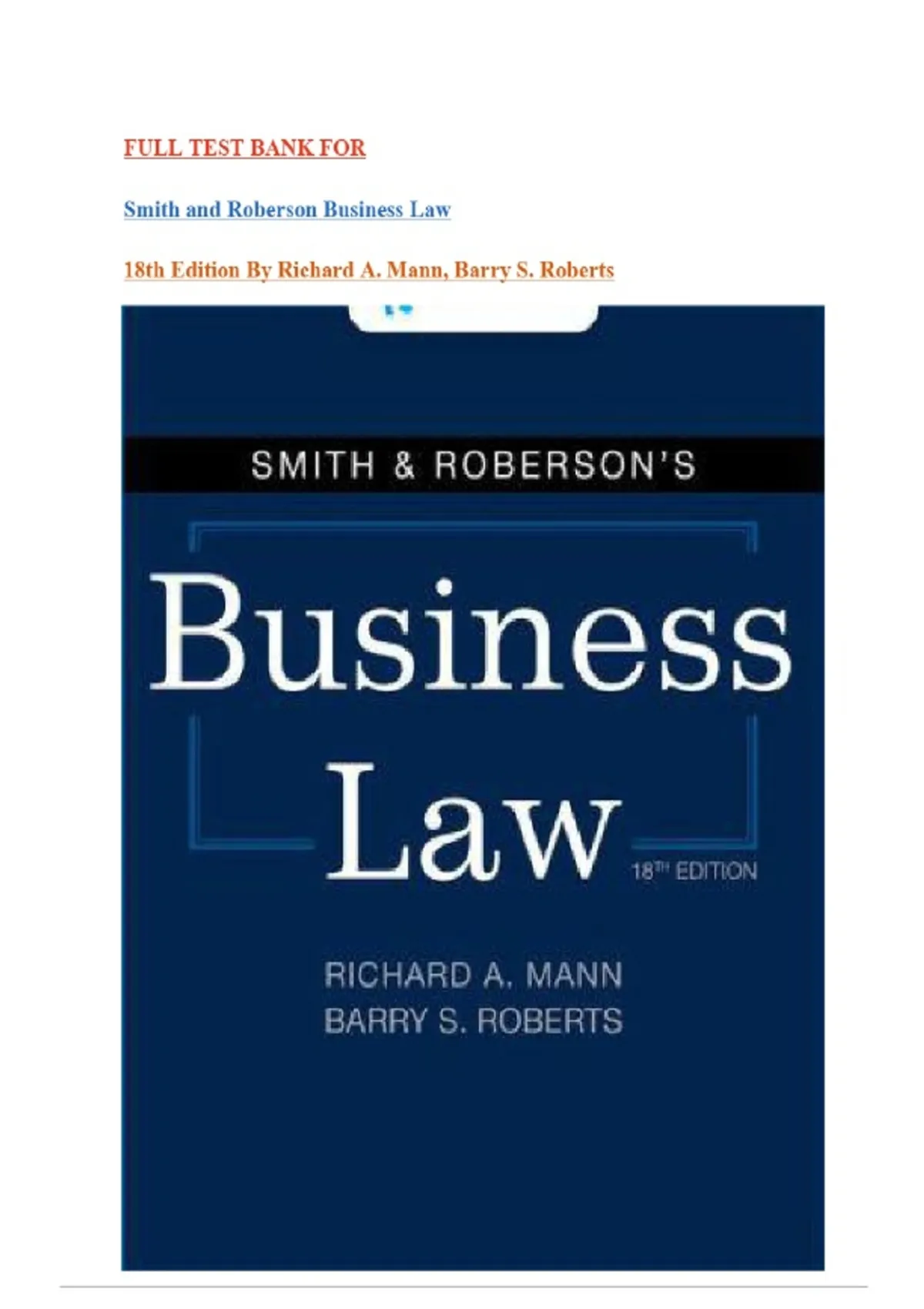 FULL TEST BANK FOR Smith and Roberson Business Law 18th Edition By Richard A. Mann, Barry S. Roberts Chapter 1-50 with Part 1-10|Latest 2026.