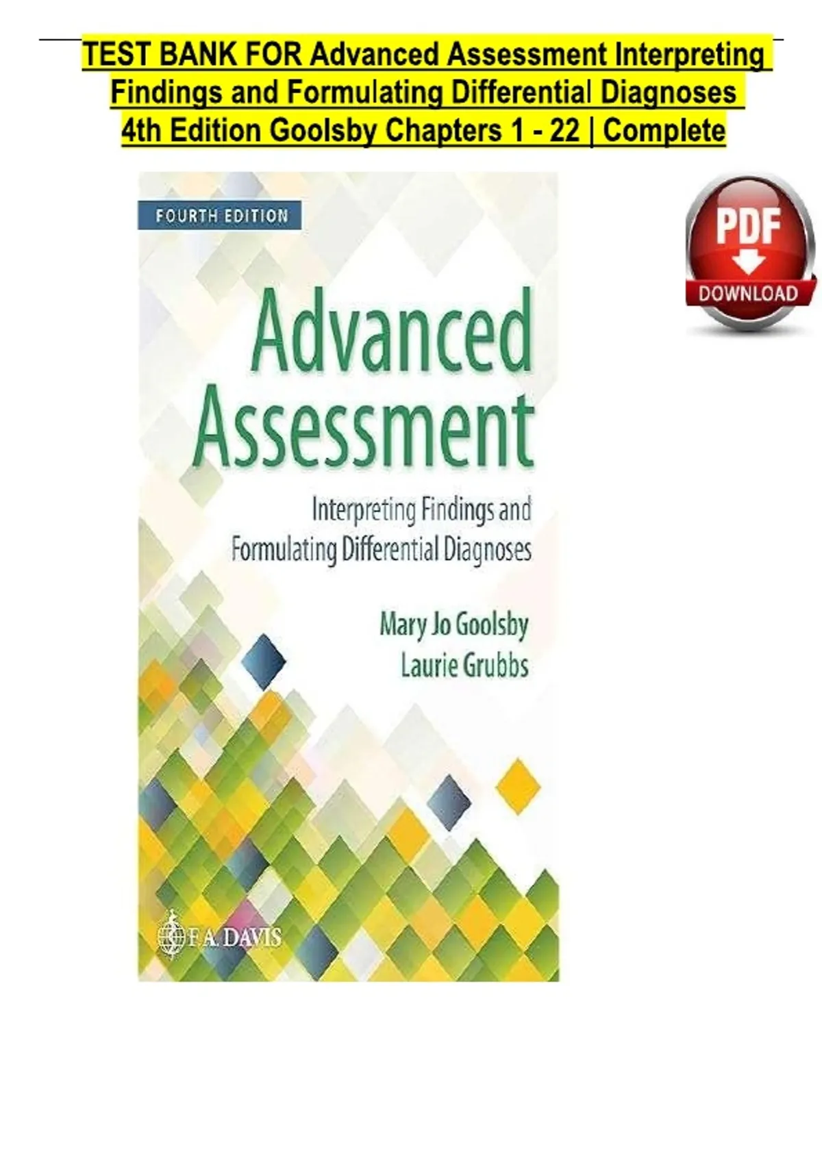 TEST BANK For Advanced Assessment Interpreting Findings and Formulating Differential Diagnoses, 4th Edition by Goolsby, Verified Chapters 1 - 22, Complete Newest VersionTEST BANK For Advanced Assessment Interpreting Findings and Formulating Differential Diagnoses, 4th Edition by Goolsby, Verified Chapters 1 - 22, Complete Newest Version